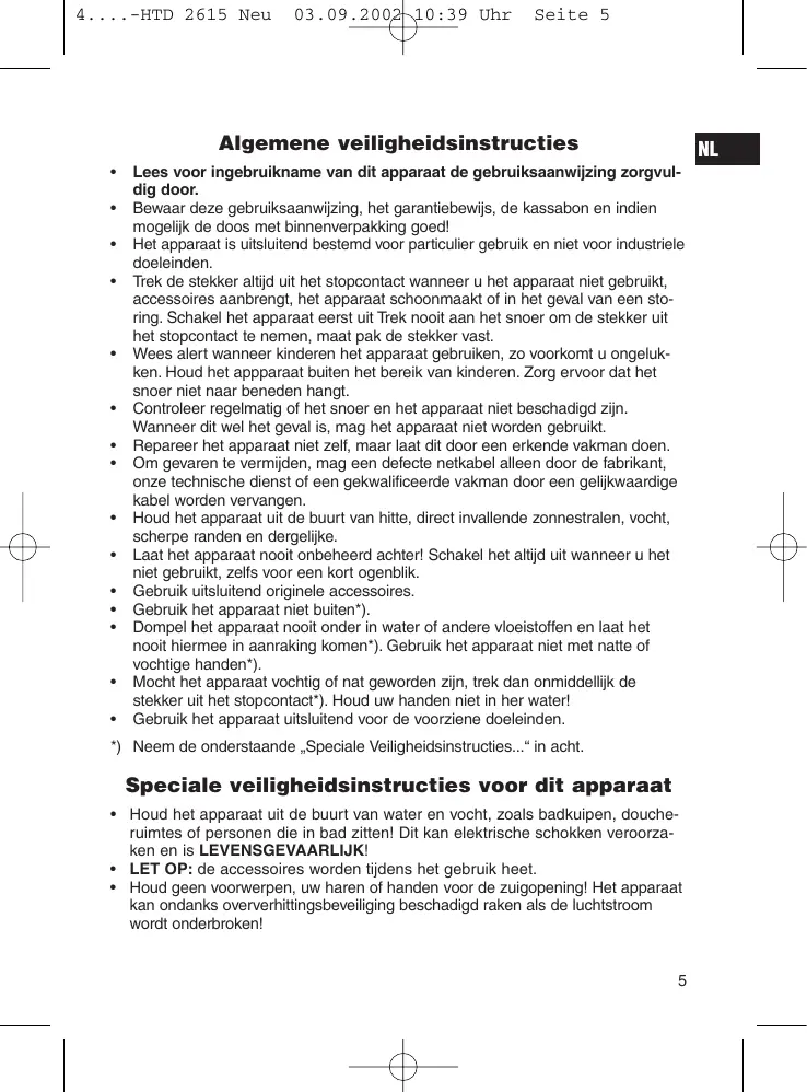Lees voor ingebruikname van dit apparaat de gebruiksaanwijzing zorgvuldig door. Bewaar deze gebruiksaanwijzing, het garantiebewijs, de kassabon en indien mogelijk de doos met binnenverpakking goed! Het apparaat is uitsluitend bestemd voor particulier gebruik en niet voor industriele doeleinden. Trek de stekker altijd uit het stopcontact wanneer u het apparaat niet gebruikt, accessoires aanbrengt, het apparaat schoonmaakt of in het geval van een storing. Schakel het apparaat eerst uit Trek nooit aan het snoer om de stekker uit het stopcontact te nemen, maat pak de stekker vast. Wees alert wanneer kinderen het apparaat gebruiken, zo voorkomt u ongelukken. Houd het appparaat buiten het bereik van kinderen. Zorg ervoor dat het snoer niet naar beneden hangt. Controleer regelmatig of het snoer en het apparaat niet beschadigd zijn. Wanneer dit wel het geval is, mag het apparaat niet worden gebruikt. Repareer het apparaat niet zelf, maar laat dit door een erkende vakman doen. Om gevaren te vermijden, mag een defecte netkabel alleen door de fabrikant, onze technische dienst of een gekwalificeerde vakman door een gelijkwaardige kabel worden vervangen. Houd het apparaat uit de buurt van hitte, direct invallende zonnestralen, vocht, scherpe randen en dergelijke. Laat het apparaat nooit onbeheerd achter! Schakel het altijd uit wanneer u het niet gebruikt, zelfs voor een kort ogenblik. Gebruik uitsluitend originele accessoires. Gebruik het apparaat niet buiten*). Dompel het apparaat nooit onder in water of andere vloeistoffen en laat het nooit hiermee in aanraking komen*). Gebruik het apparaat niet met natte of vochtige handen*). Mocht het apparaat vochtig of nat geworden zijn, trek dan onmiddellijk de stekker uit het stopcontact*). Houd uw handen niet in her water! Gebruik het apparaat uitsluitend voor de voorziene doeleinden. *) Neem de onderstaande „Speciale Veiligheidsinstructies...“ in acht. Speciale veiligheidsinstructies voor dit apparaat