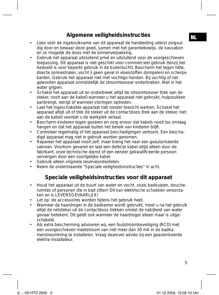 • • Si vous utilisez le sèche-cheveux dans une salle de bains, débranchez toujours le câble d’alimentation après utilisation car la proximité d’eau peut être dangereuse. Cela est également valable lorsque le sèche-cheveux est seulement arrêté. Comme sécurité supplémentaire, il est recommandé de faire installer dans le circuit électrique de la salle de bains un dispositif protecteur à courant différentiel (RCD) avec un courant dimensionnel limité à 30mA. Adressez-vous pour cela à un électricien agrée.