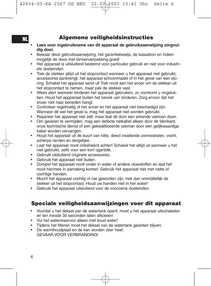 NL Laat, voordat u voor de eerste keer koffie zet, a.u.b. 2-3 keer alleen water door het apparaat lopen om het op deze wijze te reinigen. Was de filterinzet en de glazen kan af in water met wat afwasmiddel.