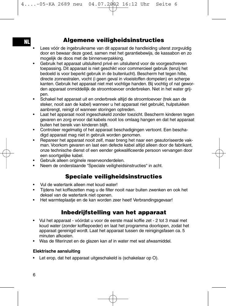 Vul de watertank alleen met koud water! Tijdens het koffiezetten mag u de filter nooit naar buiten zwenken en ook het deksel van de watertank niet openen. Het warmteplaatje en de kan worden zeer heet! Verbrandingsgevaar!