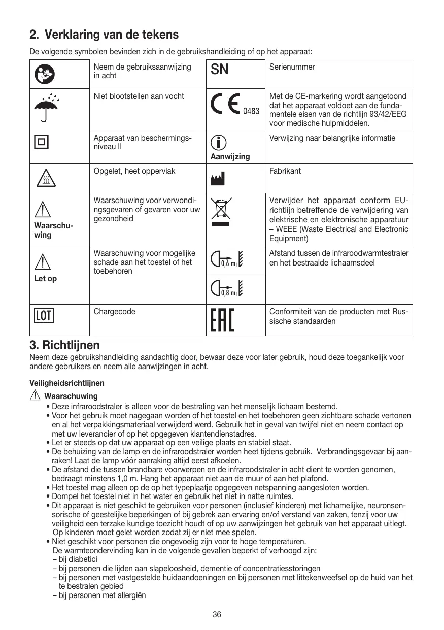 Neem deze gebruikshandleiding aandachtig door, bewaar deze voor later gebruik, houd deze toegankelijk voor andere gebruikers en neem alle aanwijzingen in acht. Veiligheidsrichtlijnen Waarschuwing • Deze infraroodstraler is alleen voor de bestraling van het menselijk lichaam bestemd. • Voor het gebruik moet nagegaan worden of het toestel en het toebehoren geen zichtbare schade vertonen en al het verpakkingsmateriaal verwijderd werd. Gebruik het in geval van twijfel niet en neem contact op met uw leverancier of op het opgegeven klantendienstadres. • Let er steeds op dat uw apparaat op een veilige plaats en stabiel staat. • De behuizing van de lamp en de infraroodstraler worden heet tijdens gebruik. Verbrandingsgevaar bij aanraken! Laat de lamp vóór aanraking altijd eerst afkoelen. • De afstand die tussen brandbare voorwerpen en de infraroodstraler in acht dient te worden genomen, bedraagt minstens 1,0 m. Hang het apparaat niet aan de muur of aan het plafond. • Het toestel mag alleen op de op het typeplaatje opgegeven netspanning aangesloten worden. • Dompel het toestel niet in het water en gebruik het niet in natte ruimtes. • Dit apparaat is niet geschikt te gebruiken voor personen (inclusief kinderen) met lichamelijke, neuronsensorische of geestelijke beperkingen of bij gebrek aan ervaring en/of verstand van zaken, tenzij voor uw veiligheid een terzake kundige toezicht houdt of op uw aanwijzingen het gebruik van het apparaat uitlegt. Op kinderen moet gelet worden zodat zij er niet mee spelen. • Niet geschikt voor personen die ongevoelig zijn voor te hoge temperaturen. De warmteondervinding kan in de volgende gevallen beperkt of verhoogd zijn: – bij diabetici – bij personen die lijden aan slapeloosheid, dementie of concentratiesstoringen – bij personen met vastgestelde huidaandoeningen en bij personen met littekenweefsel op de huid van het te bestralen gebied – bij personen met allergiën 36