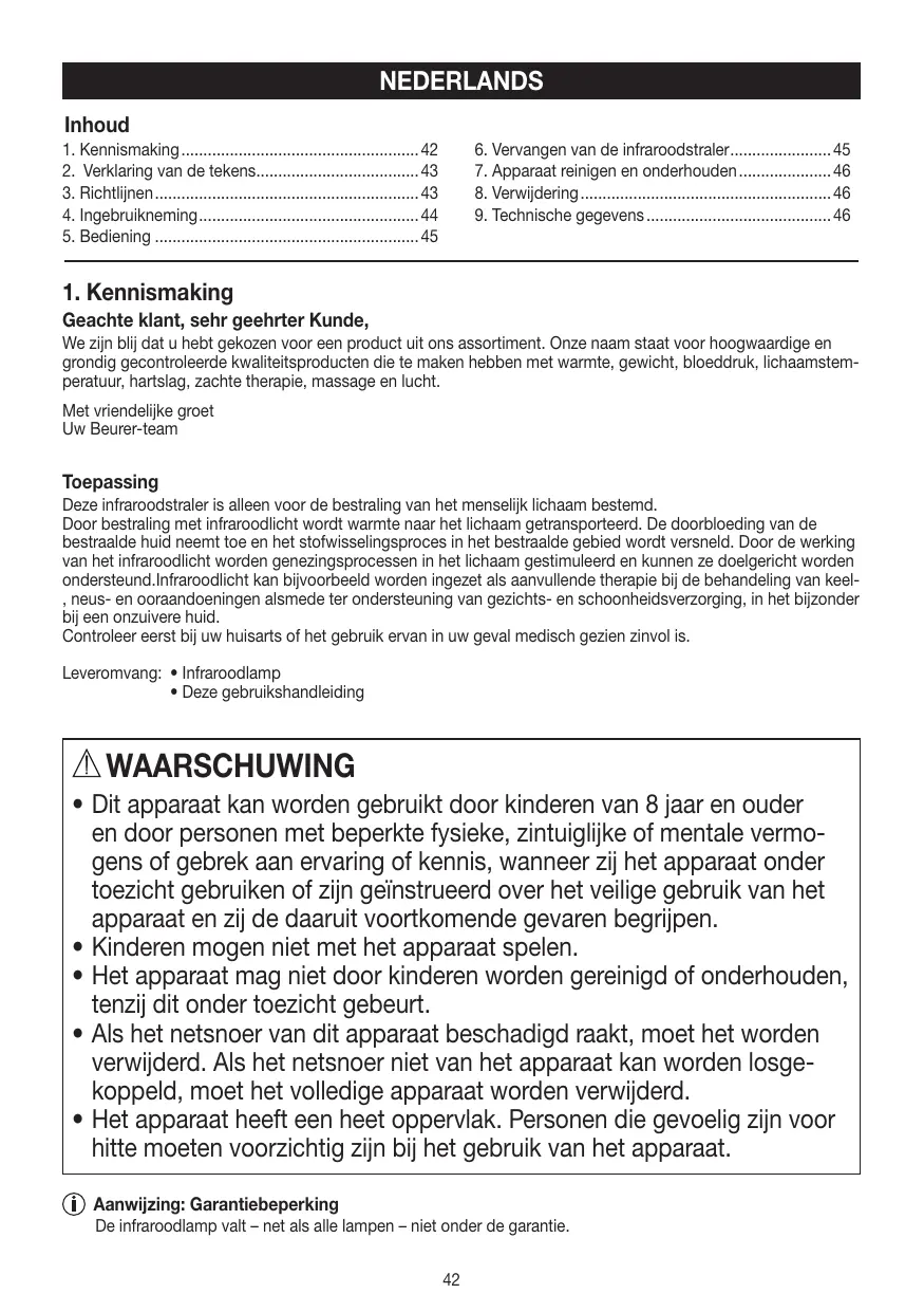 WAARSCHUWING • Dit apparaat kan worden gebruikt door kinderen van 8 jaar en ouder en door personen met beperkte fysieke, zintuiglijke of mentale vermogens of gebrek aan ervaring of kennis, wanneer zij het apparaat onder toezicht gebruiken of zijn geïnstrueerd over het veilige gebruik van het apparaat en zij de daaruit voortkomende gevaren begrijpen. • Kinderen mogen niet met het apparaat spelen. • Het apparaat mag niet door kinderen worden gereinigd of onderhouden, tenzij dit onder toezicht gebeurt. • Als het netsnoer van dit apparaat beschadigd raakt, moet het worden verwijderd. Als het netsnoer niet van het apparaat kan worden losgekoppeld, moet het volledige apparaat worden verwijderd. • Het apparaat heeft een heet oppervlak. Personen die gevoelig zijn voor hitte moeten voorzichtig zijn bij het gebruik van het apparaat. Aanwijzing: Garantiebeperking De infraroodlamp valt – net als alle lampen – niet onder de garantie. 42