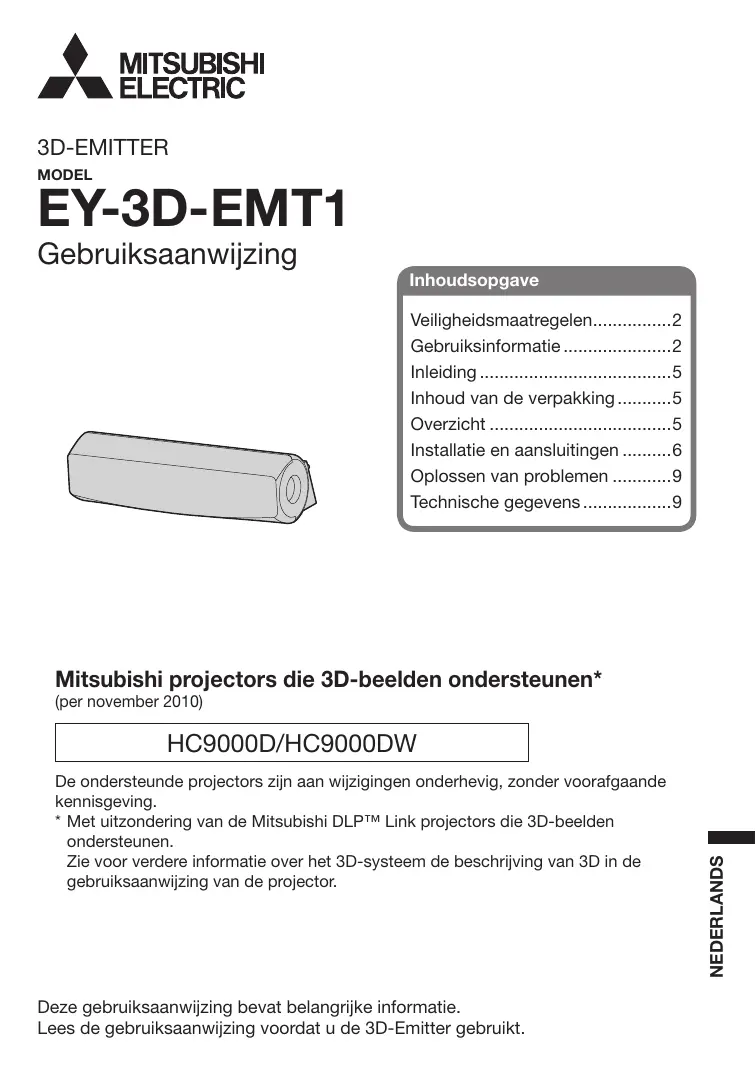 Inleiding Met deze 3D-Emitter en de los verkrijgbare 3D-Bril (EY-3DGS-1U) kunt u genieten van 3D-beelden met Mitsubishi projectors die 3D-beelden ondersteunen. Voor het kijken naar 3D-beelden of het maken van de vereiste instellingen wordt u verwezen naar de gebruiksaanwijzing van de projector.
