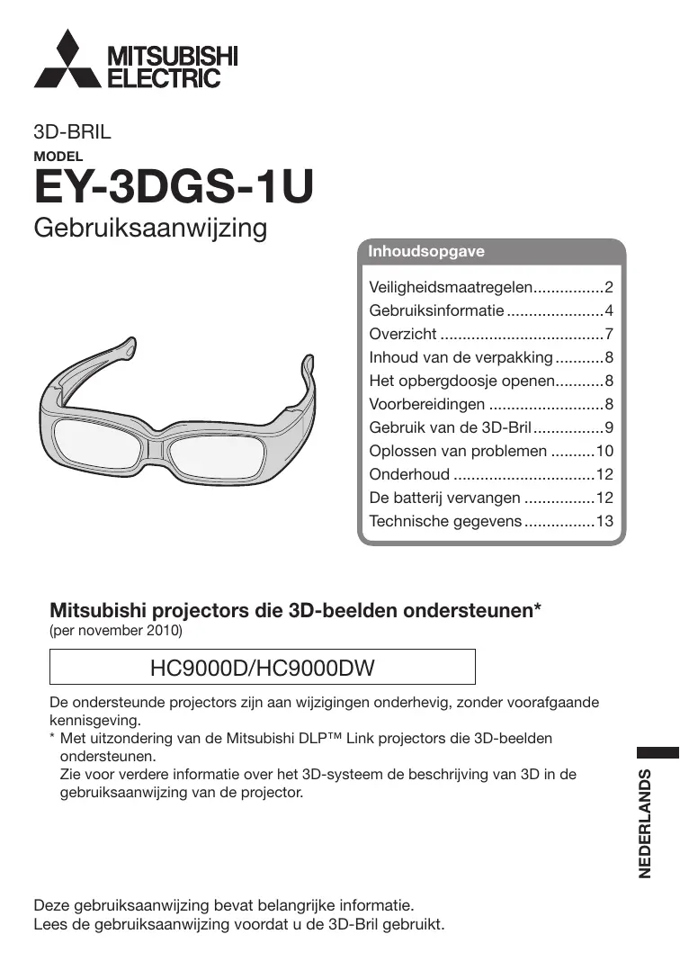 Deze gebruiksaanwijzing bevat belangrijke informatie. Lees de gebruiksaanwijzing voordat u de 3D-Bril gebruikt.