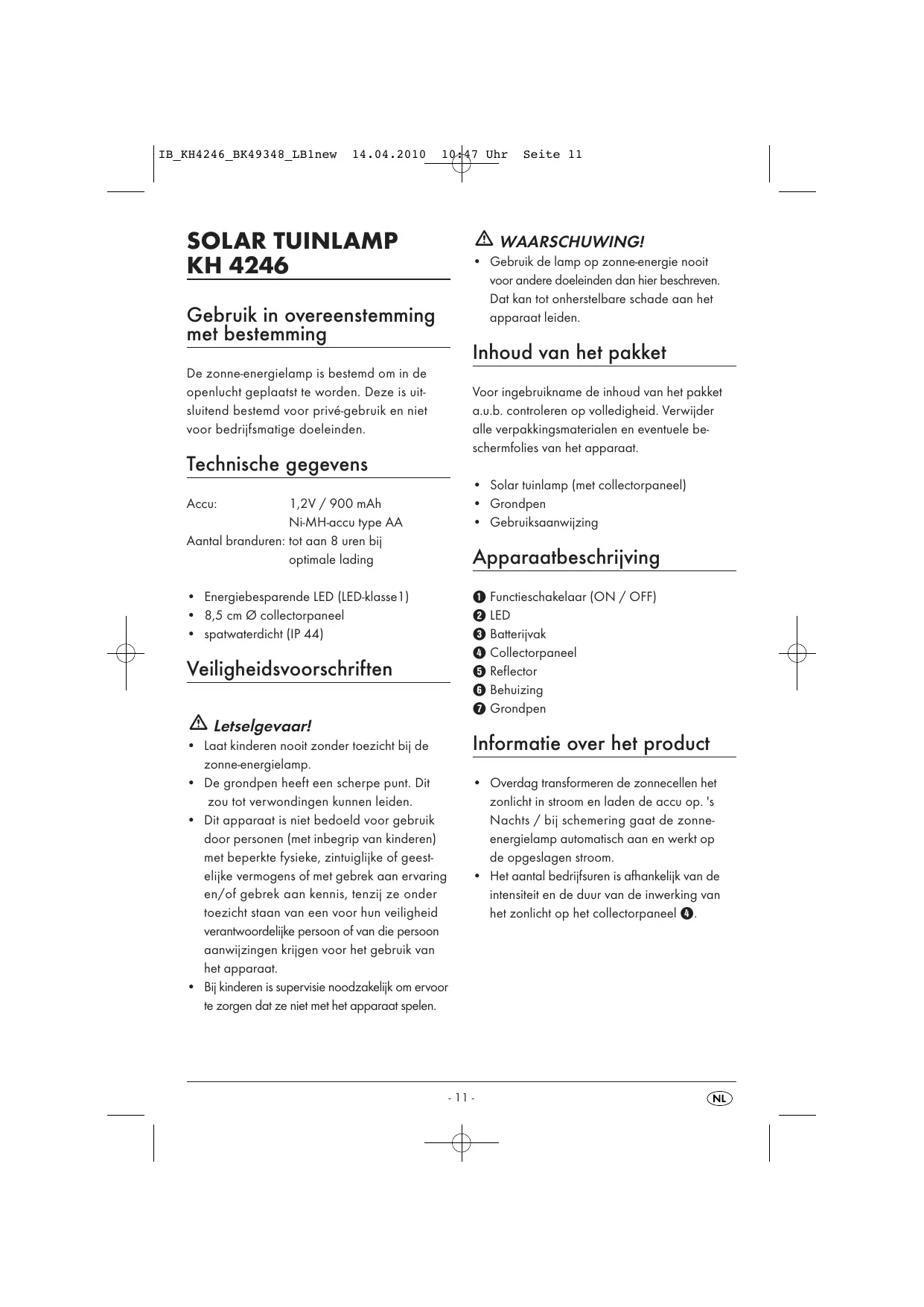 10:47 Uhr SOLAR TUINLAMP KH 4246 Gebruik in overeenstemming met bestemming De zonne-energielamp is bestemd om in de openlucht geplaatst te worden. Deze is uitsluitend bestemd voor privé-gebruik en niet voor bedrijfsmatige doeleinden. Technische gegevens Accu: 1,2V / 900 mAh Ni-MH-accu type AA Aantal branduren: tot aan 8 uren bij optimale lading