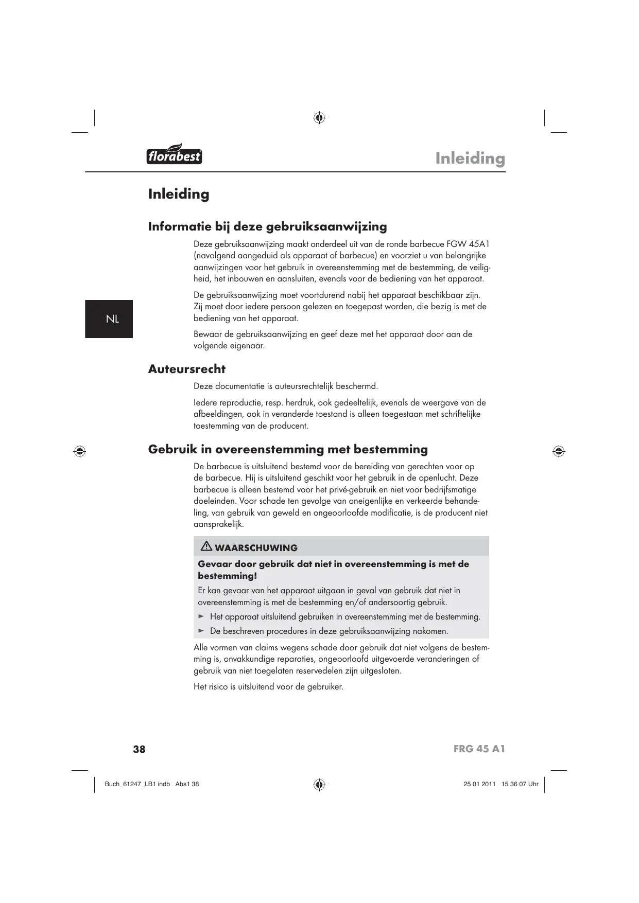25 01 2011 15 36 07 Uhr Inleiding Inleiding Informatie bij deze gebruiksaanwijzing Deze gebruiksaanwijzing maakt onderdeel uit van de ronde barbecue FGW 45A1 (navolgend aangeduid als apparaat of barbecue) en voorziet u van belangrijke aanwijzingen voor het gebruik in overeenstemming met de bestemming, de veiligheid, het inbouwen en aansluiten, evenals voor de bediening van het apparaat. De gebruiksaanwijzing moet voortdurend nabij het apparaat beschikbaar zijn. Zij moet door iedere persoon gelezen en toegepast worden, die bezig is met de bediening van het apparaat.