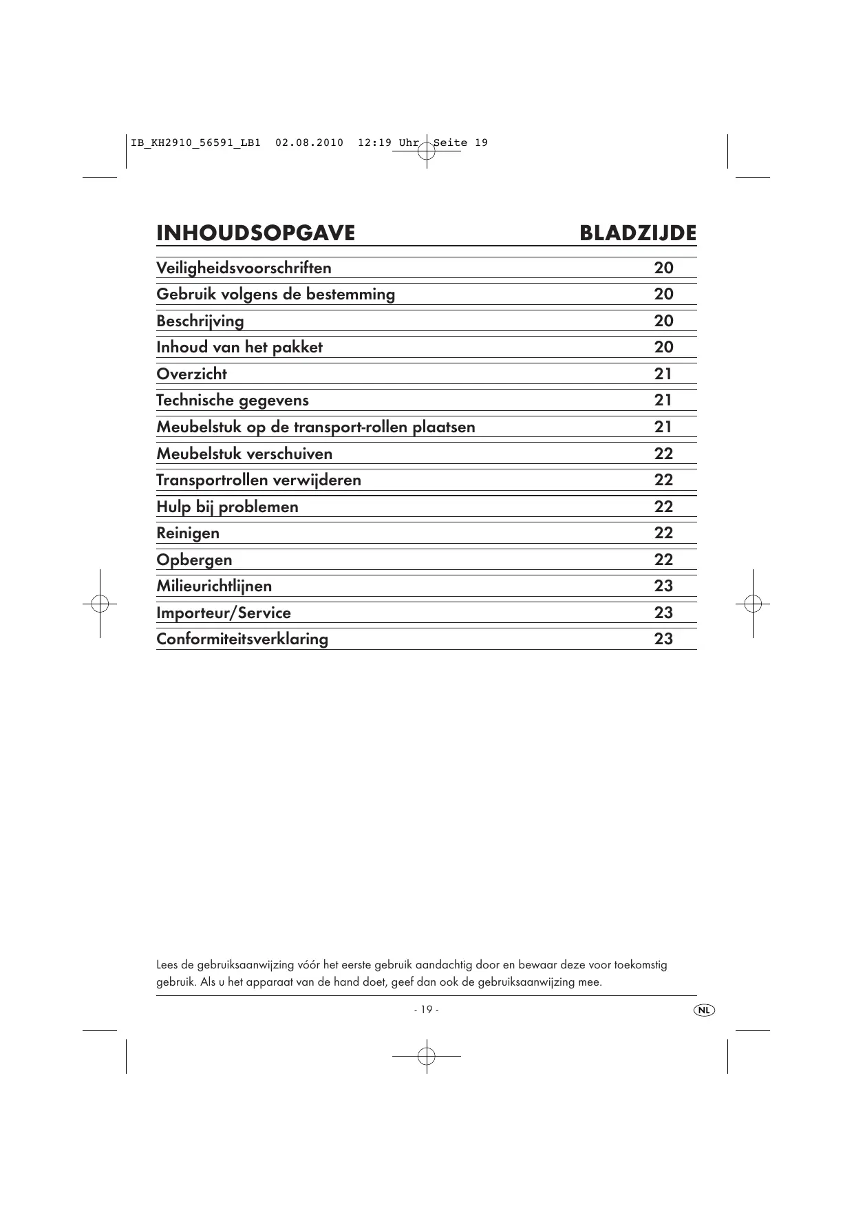 | Meubelstuk op de transport-rollenplaatsen | 21 |