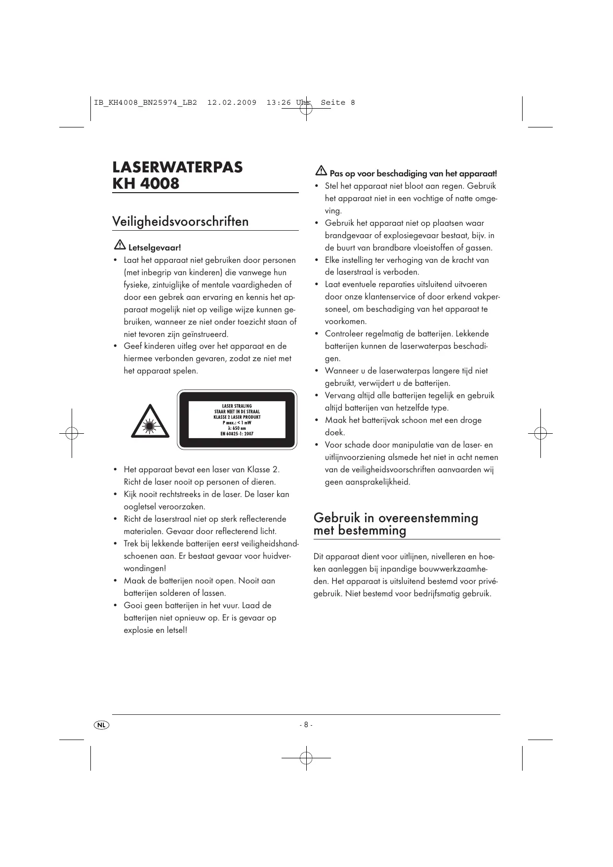 13:26 Uhr LASERWATERPAS KH 4008 Seite 8 Pas op voor beschadiging van het apparaat!