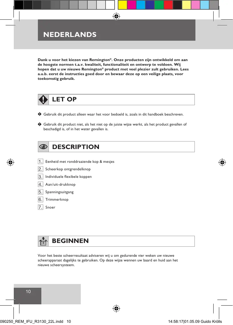 14:58:16|01.05.09 Guido Krölls nederlands Dank u voor het kiezen van Remington®. Onze producten zijn ontwikkeld om aan de hoogste normen t.a.v. kwaliteit, functionaliteit en ontwerp te voldoen. Wij hopen dat u uw nieuwe Remington® product met veel plezier zult gebruiken. Lees a.u.b. eerst de instructies goed door en bewaar deze op een veilige plaats, voor toekomstig gebruik. LET OP Gebruik dit product alleen waar het voor bedoeld is, zoals in dit handboek beschreven. ebruik dit product niet, als het niet op de juiste wijze werkt, als het product gevallen of beschadigd is, of in het water gevallen is. DESCRIPTION