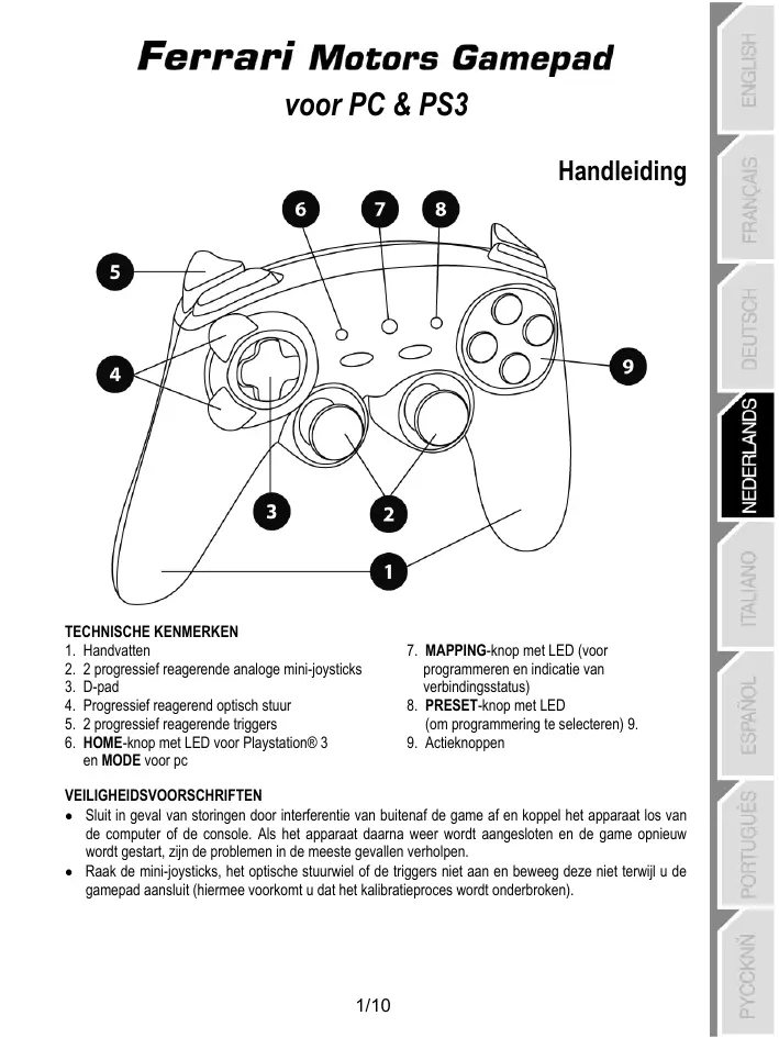 TECHNISCHE KENMERKEN 1. Handvatten 2. 2 progressief reagerende analoge mini-joysticks 3. D-pad 4. Progressief reagerend optisch stuur 5. 2 progressief reagerende triggers 6. HOME-knop met LED voor Playstation® 3 en MODE voor pc