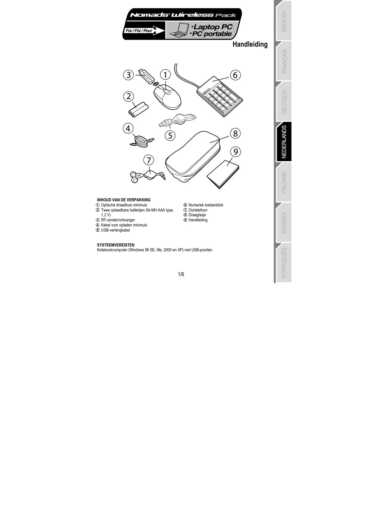 AANBEVOLEN GEBRUIK Neem voor uw eigen veiligheid de volgende voorzorgsmaatregelen in acht: - Maak onderdelen van de Nomads’ Wireless Pack nooit open omdat het gevaar bestaat dat interne componenten beschadigd raken. - Plaats de Nomads’ Wireless Pack op een vlakke ondergrond om te voorkomen dat deze valt. - Trek nooit aan een kabel en zorg dat er geen knikken in komen. - Laad de minimuis nooit op met een andere kabel dan de speciale kabel die wordt geleverd bij de Nomads’ Wireless Pack. - De batterijen van de minimuis hoeven niet verwijderd te worden als deze niet in gebruik is. De minimuis beschikt over een batterijspaarfunctie. - Maak de aansluitingen van de Nomads’ Wireless Pack los en verwijder de batterijen uit de minimuis voordat u met schoonmaken begint. Gebruik geen vloeibaar schoonmaakmiddel of een spuitbus. Gebruik een vochtige doek voor het schoonmaken.