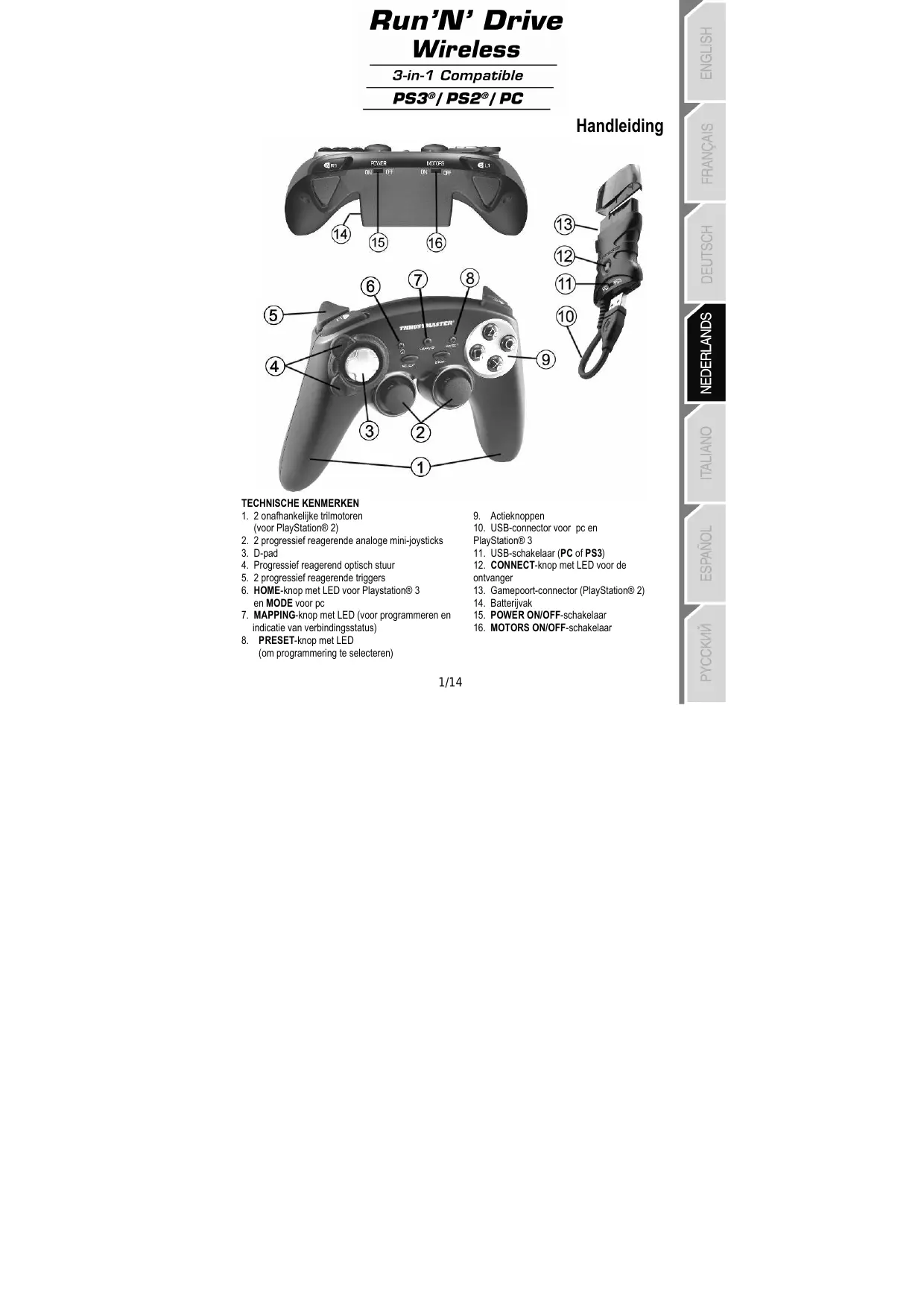 TECHNISCHE KENMERKEN 1. 2 onafhankelijke trilmotoren (voor PlayStation® 2) 2. 2 progressief reagerende analoge mini-joysticks 3. D-pad 4. Progressief reagerend optisch stuur 5. 2 progressief reagerende triggers 6. HOME-knop met LED voor Playstation® 3 en MODE voor pc 7. MAPPING-knop met LED (voor programmeren en indicatie van verbindingsstatus) 8. PRESET-knop met LED (om programmering te selecteren)