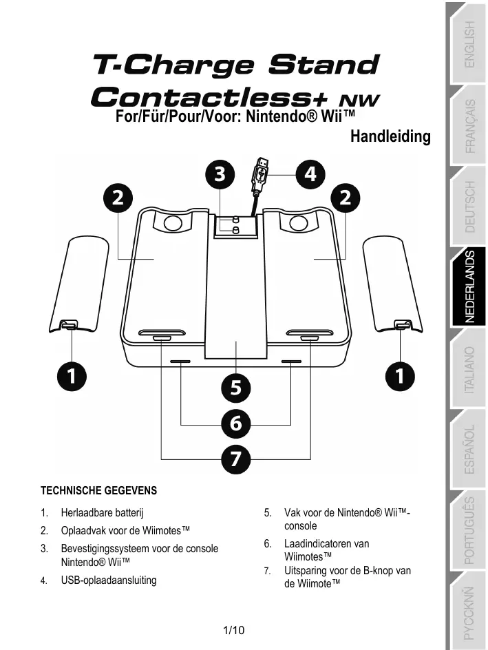 WAARSCHUWING • Lees deze documentatie aandachtig door voordat dit product in gebruik wordt genomen en bewaar zorgvuldig voor latere raadpleging. • Bewaar het product op een droge plaats vrij van stof of direct zonlicht. • Let op de polariteit en de laadtijd. • Stekkers en kabels niet verdraaien en er geen grote trekkracht op uitoefenen. • Zorg ervoor dat geen vloeistof op het product en de stekkers wordt gemorst. • Voorkom kortsluiting op het product. • De accu’s mogen uitsluitend met de meegeleverde lader worden opgeladen. • Demonteren verboden, niet in het vuur werpen en niet aan hoge temperaturen blootstellen. • Volg steeds de gebruiksvoorschriften van de Wiimote™ en van uw console die is vermeld in de handleiding van uw Nintendo® Wii™-console. LEER UW OPLAADSTATION KENNEN Dit oplaadstation maakt gebruik van de nieuwe contactloze technologie (geen connector) om uw Wiimotes™ op te laden: * Met of zonder de officiële siliconenafschermingen. * Met of zonder het accessoire Wii MotionPlus™