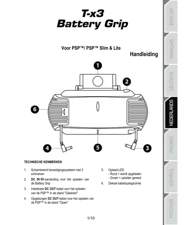 OPLAAD-LED VAN DE T-X3 BATTERY GRIP x Rode LED = de accu wordt opgeladen. x Groene LED = de accu is volledig opgeladen. BELANGRIJKE OPMERKING: voor een maximale gebruiksduur van de accu, moet u uw Sony® PSP™-console volledig EN apart opladen met de voedingsadapter van de console.