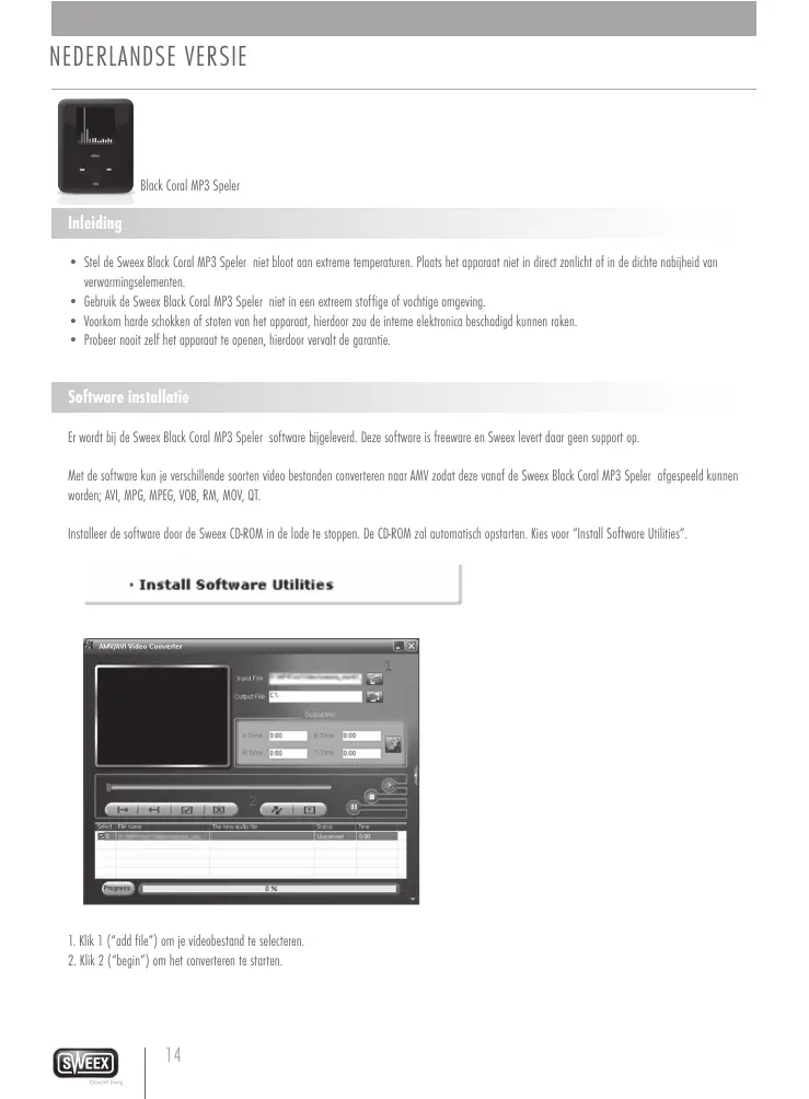 - Probeer nooit zelf het apparaat te openen, hierdoor vervalt de garantie. Software installatie Er wordt bij de Sweex Black Coral MP3 Speler software bijgeleverd. Deze software is freeware en Sweex levert daar geen support op. Met de software kun je verschillende soorten video bestanden converteren naar AMV zodat deze vanaf de Sweex Black Coral MP3 Speler afgespeeld kunnen worden; AVI, MPG, MPEG, VOB, RM, MOV, QT. Installeer de software door de Sweex CD-ROM in de lade te stoppen. De CD-ROM zal automatisch opstarten. Kies voor “Install Software Utilities”.