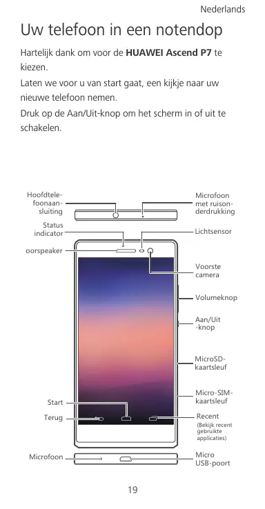 Nederlands Uw telefoon in een notendop Hartelijk dank om voor de HUAWEI Ascend P7 te kiezen. Laten we voor u van start gaat, een kijkje naar uw nieuwe telefoon nemen. Druk op de Aan/Uit-knop om het scherm in of uit te schakelen. .UULJZKRK LUUTGGT YR[OZOTM 3OIXULUUT SKZX[OYUT JKXJX[QQOTM 9ZGZ[Y OTJOIGZUX 2OINZYKTYUX UUXYVKGQKX <UUXYZK IGSKXG <UR[SKQTUV 'GT;OZ QTUV 3OIXU9* QGGXZYRK[L 3OIXU9/3 QGGXZYRK[L 9ZGXZ 8KIKTZ :KX[M (KQOPQXKIKTZ MKHX[OQZK GVVROIGZOKY 3OIXU ;9(VUUXZ 3OIXULUUT