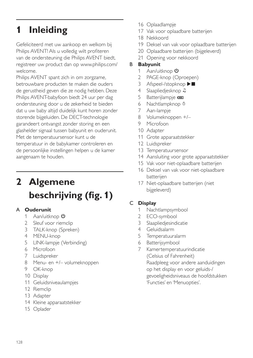 1 Inleiding Gefeliciteerd met uw aankoop en welkom bij Philips AVENT! Als u volledig wilt profiteren van de ondersteuning die Philips AVENT biedt, registreer uw product dan op www.philips.com/ welcome. Philips AVENT spant zich in om zorgzame, betrouwbare producten te maken die ouders de gerustheid geven die ze nodig hebben. Deze Philips AVENT-babyfoon biedt 24 uur per dag ondersteuning door u de zekerheid te bieden dat u uw baby altijd duidelijk kunt horen zonder storende bijgeluiden. De DECT-technologie garandeert ontvangst zonder storing en een glashelder signaal tussen babyunit en ouderunit. Met de temperatuursensor kunt u de temperatuur in de babykamer controleren en de persoonlijke instellingen helpen u de kamer aangenaam te houden. 2 Algemene beschrijving (fig. 1) A Ouderunit 1 Aan/uitknop 3 2 Sleuf voor riemclip 3 TALK-knop (Spreken) 4 MENU-knop 5 LINK-lampje (Verbinding) 6 Microfoon 7 Luidspreker 8 Menu- en +/– volumeknoppen 9 OK-knop 10 Display 11 Geluidsniveaulampjes 12 Riemclip 13 Adapter 14 Kleine apparaatstekker 15 Oplader