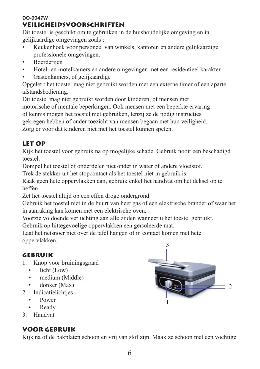 DO-9047W VEILIGHEIDSVOORSCHRIFTEN Dit toestel is geschikt om te gebruiken in de huishoudelijke omgeving en in gelijkaardige omgevingen zoals :