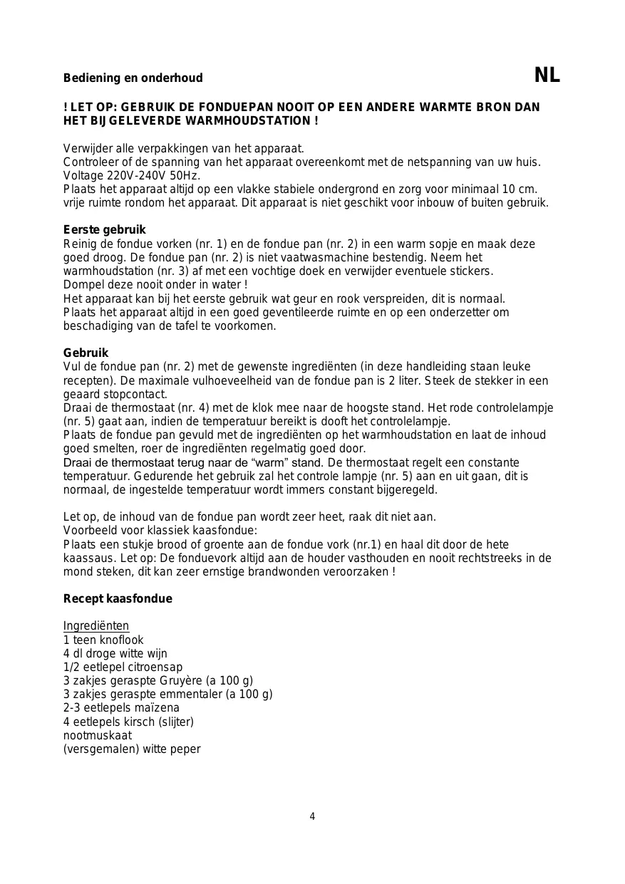 Let op, de inhoud van de fondue pan wordt zeer heet, raak dit Niet aan.