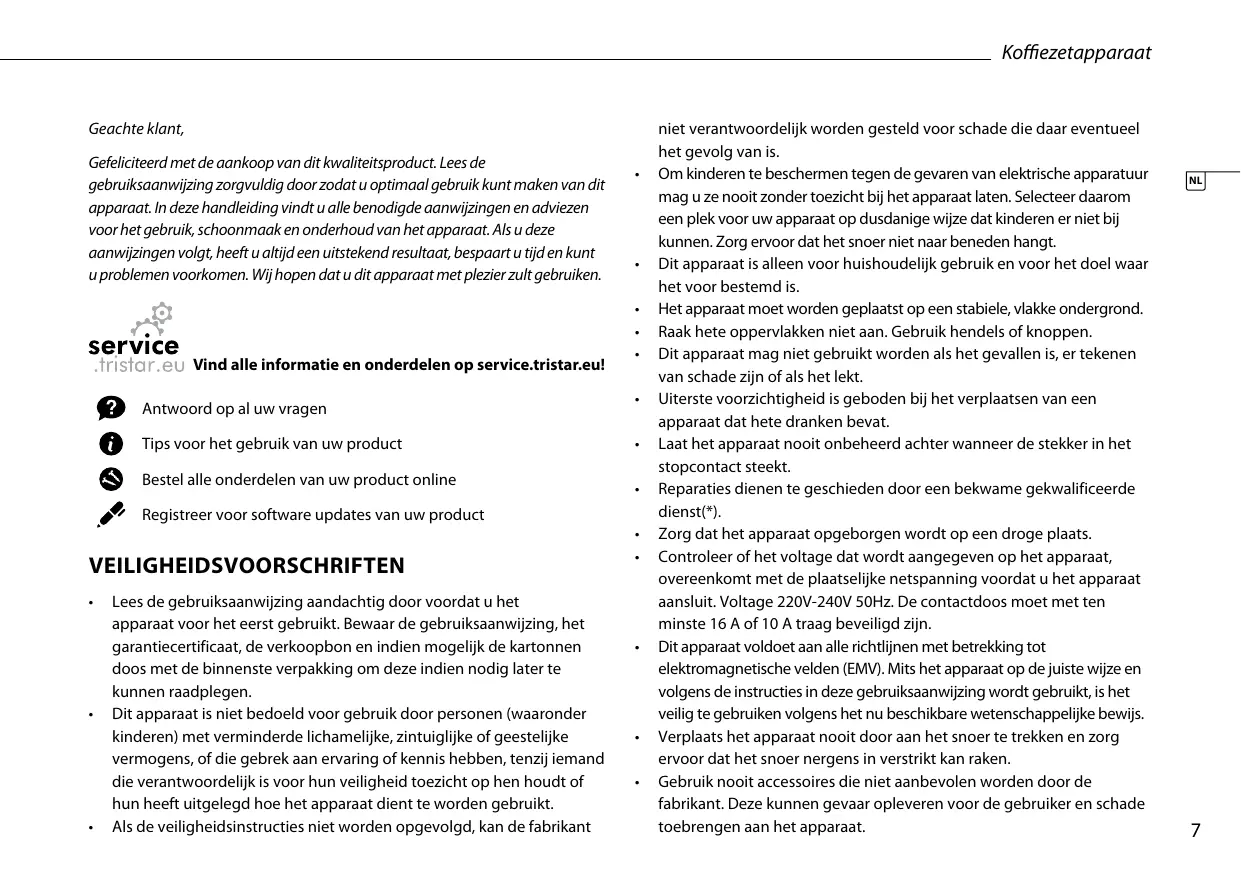 Schade aan accessoires of onderdelen betekent nicht automatisch dat het gehele apparaat za worden verrangen. Vind alle informatatie en onderdelen op www.service.tristar.eu. Afgebroken glazen/plastic onderdelen of accessoires vallen Niet onder de garantie en zullen dus.altijd gegen een vergoeding können worden verrangen.