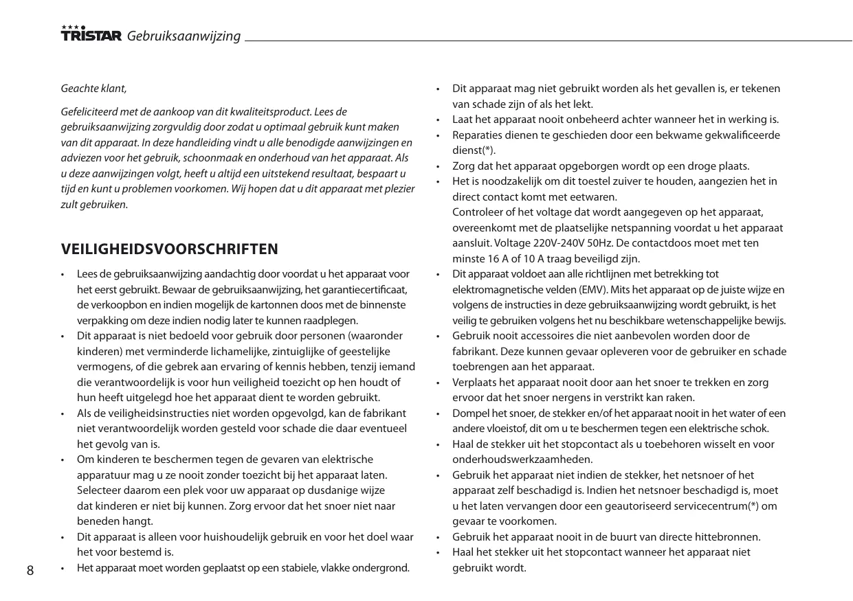 Tristar is niet verantwoordelijk voor schade: o Ten gevolge van een val of ongeluk. o Indien het apparaat technisch is gewijzigd door gebruiker of derden. o Door oneigenlijk gebruik van het apparaat. o Door normale gebruiksslijtage. Door eventuele reparatie wordt de oorspronkelijke garantieperiode van 2 jaar niet verlengd. Deze garantie is slechts geldig op Europees grondgebied. Deze garantie heft de gebruikersrechten volgens Europese richtlijn 1944/44CE niet op. Bewaar altijd uw aankoopbewijs, zonder dit aankoopbewijs kunt u geen aanspraak maken op enige vorm van garantie. Bij schade veroorzaakt door het niet opvolgen van de gebruiksaanwijzing vervalt het recht op garantie! Voor vervolgschade die hieruit ontstaat is Tristar niet aansprakelijk. Voor materiële schade of persoonlijk letsel veroorzaakt door ondeskundig gebruik of het niet opvolgen van de veiligheidsvoorschriften is Tristar niet aansprakelijk. In dergelijke gevallen vervalt elke aanspraak op garantie. Anders dan het schoonmaken, zoals genoemd in deze handleiding, is aan dit apparaat geen onderhoud noodzakelijk. Indien er reparaties moeten worden uitgevoerd, mag dit uitsluitend door een geautoriseerd bedrijf gebeuren. Het product mag niet worden gewijzigd of veranderd. Indien zich problemen zouden voordoen gedurende 2 jaar na aankoopdatum, welke gedekt zijn door de fabrieksgarantie, kunt u het apparaat ter vervanging aanbieden bij uw aankooppunt. Voor vragen of klachten kunt zich melden bij uw verkooppunt. Dit apparaat heeft 24 maanden garantie vanaf de datum van aankoop (kassabon). Uitsluitend materiaal- en/of fabricagefouten komen in aanmerking voor deze garantie.