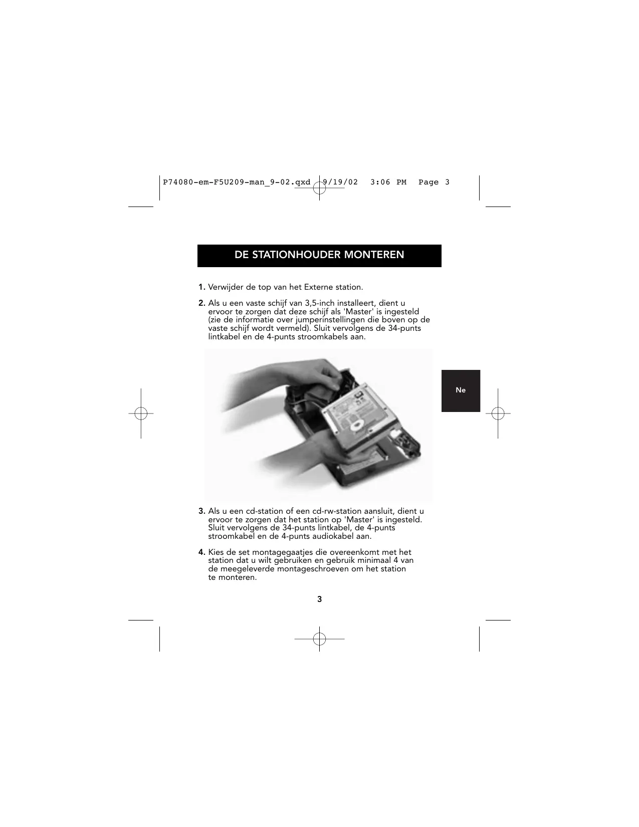 P74080-em-F5U209-man_9-02.qxd 9/19/02 3:06 PM Page 20 P74080-em-F5U209-man_9-02.qxd 9/19/02 3:06 PM Page 1 INLEIDING De houder voor externe High-Speed USB 2.0-stations (het Externe station) is een draagbaar compact opslagstation waarin een HighSpeed interface van het type USB 2.0 (Universal Serial Bus 2.0) is ingebouwd. Het Externe station biedt een snelle en makkelijke manier om uw computer van meer opslagruimte te voorzien. De plug-andplay-functie biedt u veel gemak als u wel eens met de computer onderweg bent. U kunt het Externe station makkelijk via de USBinterface op uw computer aansluiten en het is zelfs mogelijk de verbinding met de computer aan te brengen en los te koppelen terwijl de computer actief is. Opmerking: als u de High-Speed USB 2.0-modus (480Mbps) wilt inschakelen, dient uw computer te zijn uitgerust met ingebouwde USB 2.0-poorten of een USB 2.0-hostadapterkaart.