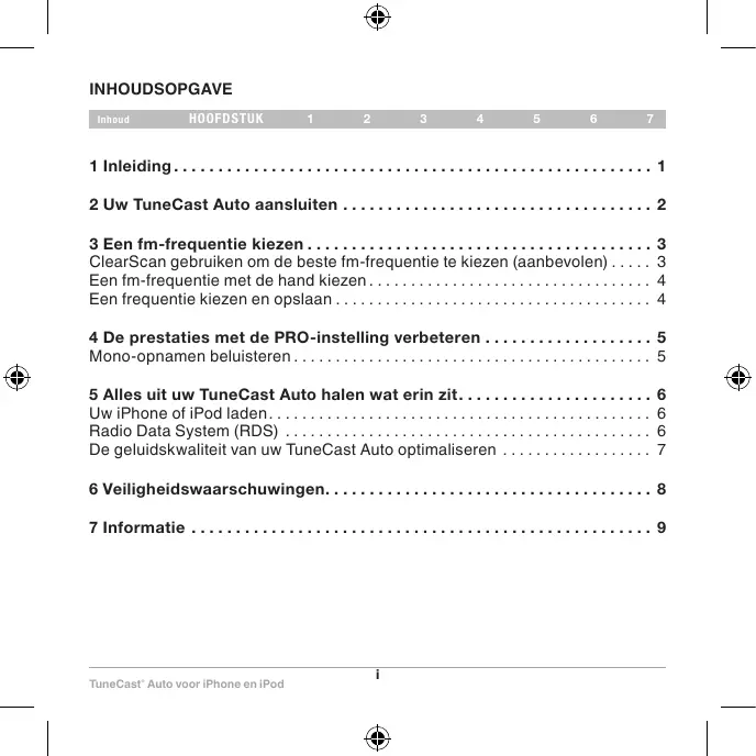 1 Inleiding 1 2 Uw TuneCast Auto aansluiten 2 3 Een fm-frequentie kiezen 3 ClearScan gebruiken om de beste fm-frequentie te kiezen (aanbevolen) 3 Een fm-frequentie met de hand kiezen 4 Een frequentie kiezen en opslaan 4 4 De prestaties met de PRO-instelling verbeteren 5 Mono-opnamen beluisteren 5 5 Alles uit uw TuneCast Auto halen wat erin zit 6 Uw iPhone of iPod laden 6 Radio Data System (RDS) 6 De geluidskwaliteit van uw TuneCast Auto optimaliseren 7 6 Veiligheidswaarschuwingen 8 7 Informatie 9 TuneCast Auto voor iPhone en iPod