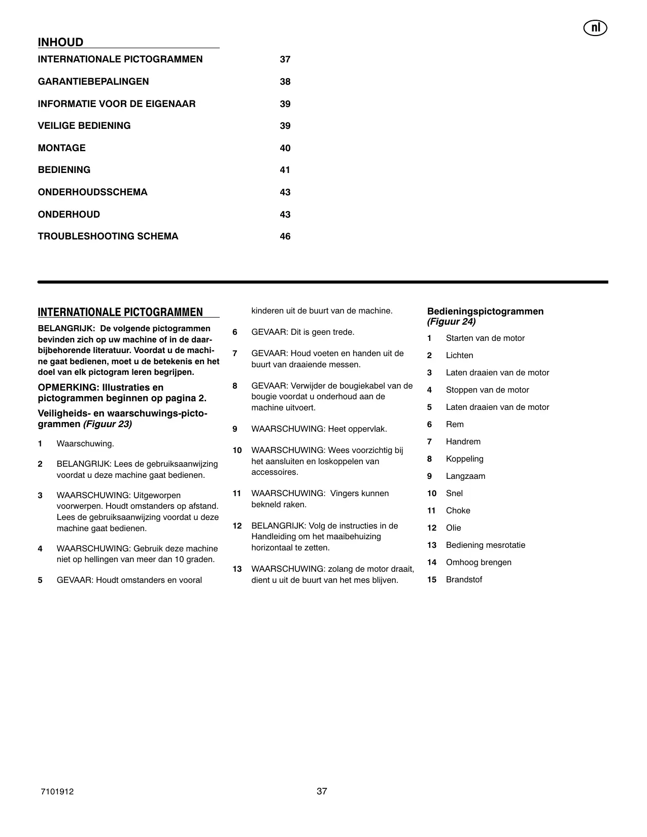 6. Duw de bougiekabel weer op de bougie. Maai een korte afstand en controleer opnieuw de kwaliteit van het gemaaide gras. Zet de mesaandrijfveer (2) in het onderste gat (5), indien nodig. 7. Controleer de kwaliteit van het gemaaide gras opnieuw. Als de kwaliteit nog niet verbeterd is, moet u de maaiaandrijfriem vervangen. Als dit ook niet helpt, moet u de maaier naar een erkend service center brengen. 8. Zet de mesrotatiebediening in de DISENGAGE stand (1) en zet de motor af. 9. (Figuur 10) Controleer de werking van de mesrem. Draai de schijven met de hand en vergewis u ervan dat de remblokken (7) tegen de schijven drukken. WAARSCHUWING: Als de remblokken (7) niet stevig tegen de schijven drukken, moet u de maaier naar een erkend service center brengen. 10. (Figuur 8) Zet de mesrotatiebediening in de ENGAGE stand (2). 11. (Figuur 10) Controleer de remblokken (1) van de mesrem (7). Vervang de remblokken als ze sterk versleten of beschadigd zijn. De juiste onderdelen en assistentie zijn verkrijgbaar via een erkend service center. 12. Duw de bougiekabel weer op de bougie. Maai een korte afstand en controleer opnieuw de werking van de mesrotatie. 13. Als u de mesrotatiebediening in de DISENGAGE stand zet, moet het geheel binnen vijf seconden tot stilstand komen. Als u een nieuwe maaiaandrijfriem heeft en deze speling vertoont of het mes blijft doordraaien, moet u de mesrotatie vijf keer in- en uit-schakelen om overmatig rubber van de riem te verwijderen. Breng de maaier naar een erkend service center als u hulp nodig heeft. 7101912 3. Zorg ervoor dat de versnellingshendel in de NEUTRAL stand staat. 4. Duw de machine naar voren en zorg dat de tandwielkast vrij (in de neutrale stand) staat. 5. Breng de instelmoer (2) op één lijn met het gat in de schakelarm (3) door aan de instelmoer (2) te draaien. 6. Maak de instelmoer (2) weer vast aan de schakelarm (3). 7. Vergewis u ervan dat de NEUTRAL stand van de versnellingshendel nu overeenkomt met de werkelijke neutrale (vrij) stand van de tandwielkast.
