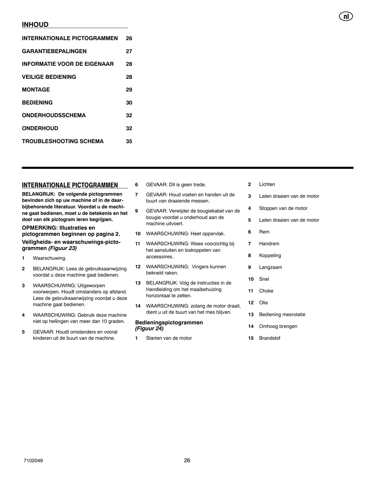 Normale Slijtage: Door kleine motoren aangedreven machines hebben, net als alle mechanische apparaten, periodiek onderhoud en vervanging van onderdelen nodig om goed te presteren. Garantie dekt geen reparaties wanneer normaal gebruik de levensduur van het product of onderdeel heeft uitgeput. Installatie: Deze garantie is niet van toepassing op producten die onderhavig zijn geweest aan verkeerde of niet geautoriseerde installatie, verandering of modificatie. Noch installaties die starten voorkomen of onbevredigende motorprestaties veroorzaken. Verkeerd Onderhoud: De levensduur van deze machine hangt af van de omstandigheden waaronder deze werkt, evenals het onderhoud dat wordt uitgevoerd. Aanbevolen onderhoud en afstelintervallen zijn afgedrukt in de Gebruiksaanwijzing. Vaak worden producten zoals grondfrezen, kantenmaaiers en cirkelmaaiers gebruikt in stoffige omstandigheden, waardoor wat lijkt op voortijdige slijtage kan optreden. Zulke slijtage, indien veroorzaakt door stof, vuil of ander schurend materiaal dat het product kan binnendringen door verkeerd onderhoud, wordt niet door garantie gedekt. De garantie zal geen reparaties dekken die het gevolg zijn van vervangingsonderdelen die niet-origineel geproduceerde onderdelen zijn. Verkeerde en/of onvoldoende brandstof of smering: Deze garantie dekt geen schade door het gebruik van verouderde brandstof, of gemanipuleerde benzines. Schade aan de motor of motorcomponenten, zoals verbrandingskamer, kleppen, klepzetels, klepgeleiders, verbrande startmotorwikkelingen veroorzaakt door alternatieve brandstoffen zoals LPG, aardgas, worden niet gedekt tenzij de motor hiervoor is gecertificeerd. Onderdelen die zijn ingelopen of gebroken doordat het product was gebruikt met onvoldoende, vervuilde of de verkeerde kwaliteit smeerolie, evenals productcomponenten die zijn beschadigd door onvoldoende smering zijn niet gedekt. Misbruik tijdens gebruik: Het correcte gebruik van het product is vermeld in de gebruiksaanwijzing. Producten die beschadigd zijn door over toeren draaien, oververhitting, of gebruik in een afgesloten ruimte zonder voldoende ventilatie, producten die defect geraakt zijn door overmatige trillingen door een losse motorbevestiging, losse of niet-gebalanceerde messen, aandrijvingen, over toeren draaien, of een kromme krukas door het raken van een vast voorwerp, schade of storing ten gevolge van ongelukken, misbruik of verkeerde service of verstarring of chemische vervorming, evenals gebruik buiten de aanbevolen capaciteiten als aangegeven in de gebruiksaanwijzing wordt niet gedekt. Routinematig onderhoud, slijtdelen of afstellingen: Deze garantie sluit slijtdelen zoals olie, snaren, messen, O-ringen, filters enz. uit. Overige uitsluitingen: Reparatie of afstellingen voor onderdelen die niet zijn gefabriceerd door de Briggs & Stratton Corporation, zijn niet gedekt, raadpleeg de garantie voor de betreffende fabrikanten. Deze garantie sluit defecten uit die het gevolg zijn van natuurrampen en andere overmacht die niet binnen de macht van de fabrikant ligt. Ook zijn gebruikte, gereviseerde en demonstratieproducten uitgesloten. Garantieservice is uitsluitend beschikbaar via Geautoriseerde Servicedealers. U kunt uw dichtstbijzijnde dealer vinden in onze “locator map” bij www.murray.com.