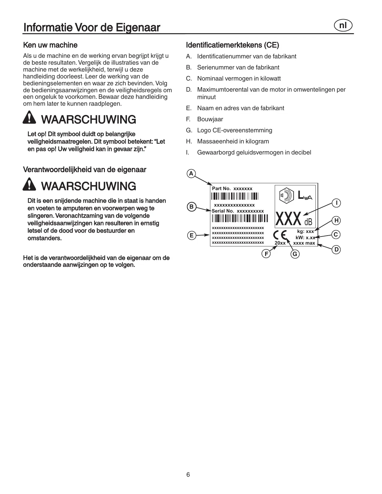 4. Changer les amortisseurs de bruit défectueux. 5. Avant toute utilisation, s’assurer que les lames, boulons de lames et positionnement des lames ne soient pas usés ou endommagés. Remplacer les lames et boulons usés ou endommagés en même temps afin de respecter l’équilibre. 6. En ce qui concerne les tondeuses multi lames, prendre garde lors de la rotation d’une lame car celle-ci peut entraîner la rotation des autres.