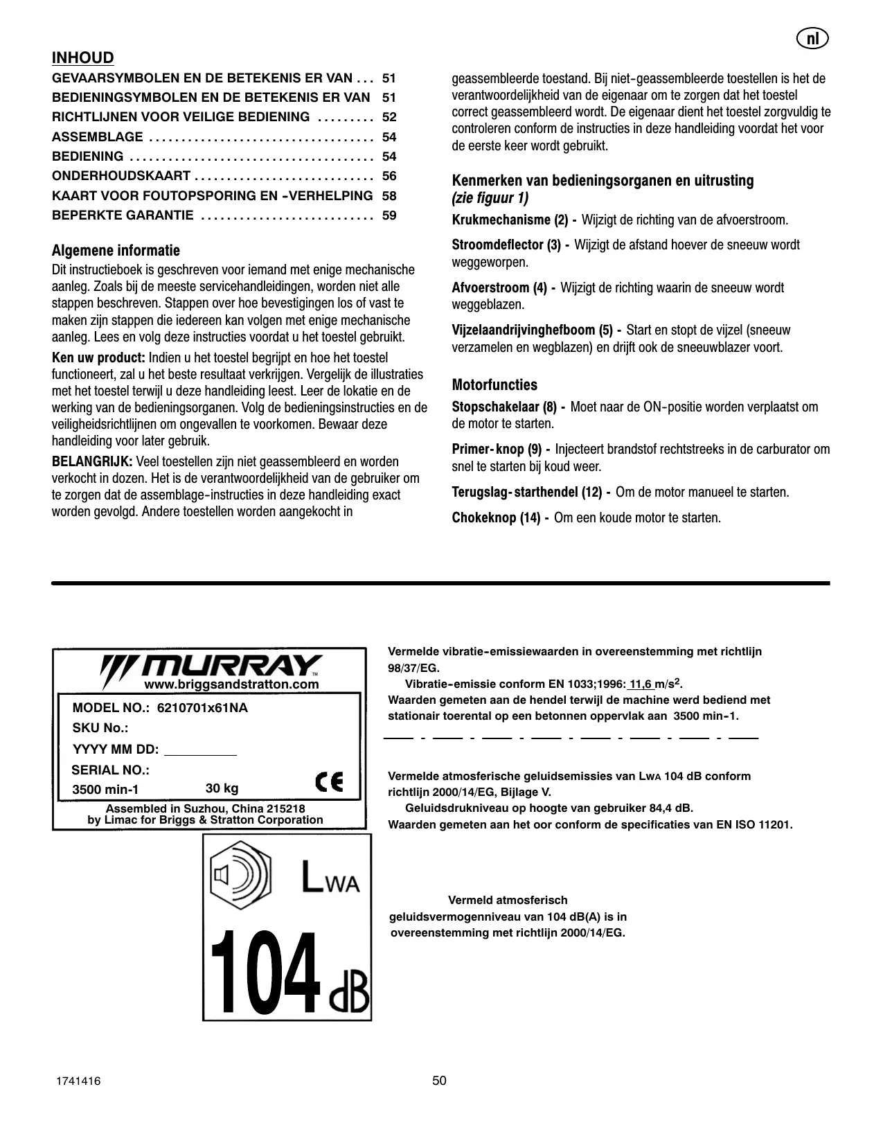 MODEL NO.: 6210701x61NA SKU No.: Valeurs déterminées au niveau du guidon avec la machine en fonctionnement à 3500 tours par minute, en position stationnaire, sur une surface en béton.