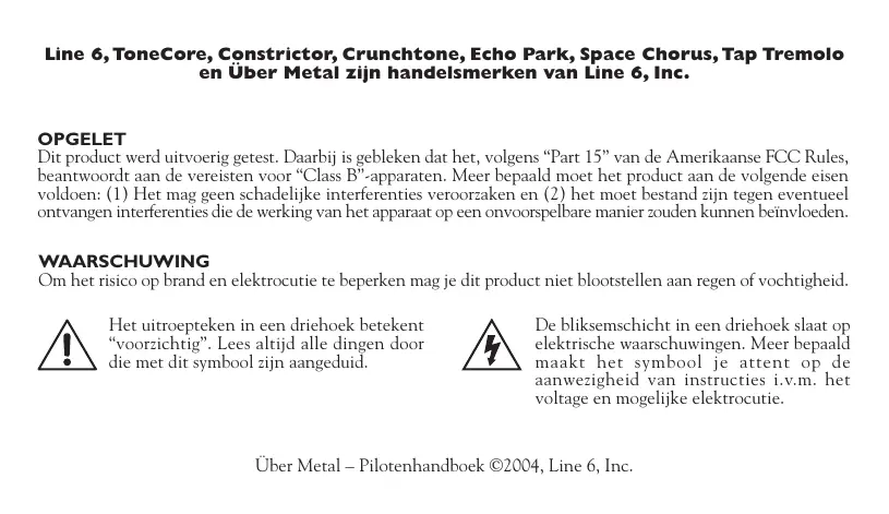 OFF • 1 • 2 Monster Metal “Slicen”, “shredden” en het publiek de vernieling in spelen, luidt hier de leuze! De gate reageert bijzonder alert, zodat je je akkoorden kunt afdempen en al die gemene Nu Metal-technieken kunt gebruiken. Über Metal-Pilotenhandboek Registreer je product nu meteen op www.line6.com/register. Of vul de bijgevoegde registratiekaart in en stuur ze met de post op. Dan beschikken we over alle belangrijke gegevens en kunnen we je eventueel sneller helpen. Bovendien kunnen we je dan op de hoogte houden van productverbeteringen, nieuwe producten en andere belangrijke weetjes. Bedankt voor de moeite en succes met je muziek! Line 6, Inc. (“Line 6”), garandeert dat dit product, indien het bij een erkende Line 6-dealer in de VS of Canada werd gekocht, geen enkel gebrek vertoont en, vanaf de dag van de oorspronkelijke aankoop, gedurende één (1) jaar geen enkele ingreep behoeft. Gebruikers in andere landen kunnen bij de Line 6-dealer, waar ze het product gekocht hebben, informatie inwinnen over de plaatselijke garantiebepalingen. Tijdens de garantieperiode heeft Line 6 het recht om producten hetzij te herstellen, hetzij te vervangen, als er sprake is van een defect. Line 6 behoudt zich het recht voor om een teruggestuurd product zonder voorafgaande kennisgeving te updaten en alle voor een productverbetering noodzakelijke handelingen uit te voeren. Line 6 heeft het recht gebruikte onderdelen voor herstellingen of werken in het kader van de garantiebepalingen te gebruiken. Deze garantie geldt voor de eerste koper, die het product bij een erkende dealer heeft aangekocht. De garantie kan echter overgaan op de persoon, die het product op een later tijdstip koopt, indien dit binnen de garantieperiode gebeurt en indien de nieuwe eigenaar Line 6 daarvan d.m.v. de volgende documenten op de hoogte brengt: (i) alle gegevens voor de registratie van de garantie (zie de garantiekaart) in naam van de nieuwe eigenaar, (ii) een bewijs voor de wettelijke overdracht opgemaakt binnen de 30 dagen na de aankoop, (iii) een fotokopie van de originele factuur. Line 6 bepaalt als enige of de garantie al dan niet overgaat op de nieuwe eigenaar. Dit is de enige garantie waar jij recht op hebt. Bij deze verbiedt Line 6 alle personen, met inbegrip van dealers en vertegenwoordigers, om in naam van Line 6 verantwoordelijkheid op te nemen of waarborgen te geven die buiten het bestek van deze bepalingen vallen. Garantiebepalingen Line 6 heeft op elk moment het recht om een bewijs van de oorspronkelijke aankoop in de vorm van de originele factuur of een ontvangstbewijs te eisen. Herstellingen en onderhoudswerken aan Line 6-apparaten mogen uitsluitend in de fabriek of door een erkende herstellingsdienst worden uitgevoerd. Line 6 beslist als enige of een herstellingsdienst de voorgestelde herstelling al dan niet mag uitvoeren. Bij het uitvoeren van niet toegelaten onderhoudswerken, herstellingen of wijzigingen aan het product vervalt de garantie onmiddellijk.