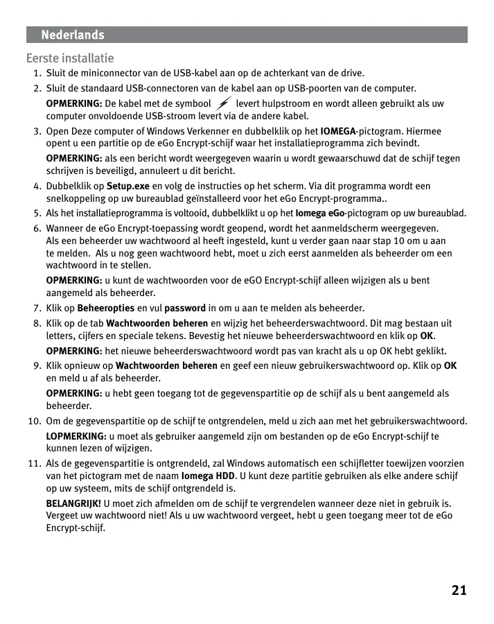 - Sluit de kabels op andere USB-poorten op de computer aan. Als wel het IOMEGA-pictogram wordt weergegeven maar er is geen pictogram voor de Iomega HDDgegevenspartitie, dubbelklikt u op het pictogram Iomega eGo op uw bureaublad en geeft u het gebruikerswachtwoord op om de schijf te ontgrendelen. De Iomega HDD –partitie is alleen zichtbaar wanneer u bent aangemeld als gebruiker. Als het probleem zich blijft voordoen, raadpleegt u het ondersteuningsgedeelte op www.iomega.com voor aanvullende hulp. De schijf gebruiken Gebruikerstoegang Als u als gebruiker bent aangemeld, hebt u toegang tot de HDD-gegevenspartitie op de eGo Encryptschijf. Zo kunt u op de gegevenspartitie bestanden bekijken, wijzigen en maken. Als u als gebruiker bent aangemeld, kunt u geen wachtwoorden wijzigen of de gegevens op de schijf veilig wissen. Om de beveiliging van de schijf te waarborgen, dient u zich altijd af te melden als u de schijf niet gebruikt. Als u de schijf van de USB-poort wilt loskoppelen, meldt u zich eerst af en start u vervolgens via uw besturingssysteem het proces voor veilige verwijdering. WAARSCHUWING! Koppel de schijf nooit los tijdens gegevensoverdracht (wanneer het statuslampje knippert). Zo vermijdt u dat er gegevens verloren gaan. Beheerderstoegang De beheerder van de schijf kan de wachtwoorden voor de beheerder en gebruiken instellen en wijzigen. De beheerder van de schijf kan de gegevens op de schijf ook veilig wissen zodat alle gegevens die op de schijf zijn opgeslagen worden gewist. Als u bent aangemeld als beheerder hebt u geen toegang tot de gegevenspartitie op de schijf Veilig wissen Veilig wissen is een onomkeerbare procedure voor het wissen van alle gegevens die op de Iomega HDD-gegevenspartitie zijn opgeslagen. U moet zijn aangemeld als beheerder om de procedure voor veilig wissen te kunnen uitvoeren. Nadat u de procedure voor veilig wissen hebt voltooid, moet u de gegevenspartitie formatteren met behulp van een NTFS-bestandssysteem. U moet zich afmelden als beheerder en aanmelden als gebruiker om de gegevenspartitie te formatteren. Raadpleeg de HTMLgebruikershandleiding voor gedetailleerde instructies. Gebruikershandleiding Een volledige gebruikershandleiding in HTML-indeling is beschikbaar via het gedeelte Support op www.iomega.com.