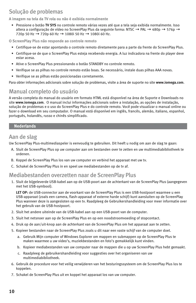 - Verifique se as pilhas estão posicionadas corretamente. Para obter informações adicionais sobre solução de problemas, visite a área de suporte no site www.iomega.com. Manual completo do usuário A versão completa do manual do usuário em formato HTML está disponível na área de Suporte e Downloads no site www.iomega.com. O manual inclui informações adicionais sobre a instalação, as opções de instalação, solução de problemas e o uso do ScreenPlay Plus e do controle remoto. Você pode visualizar o manual online ou fazer o download em seu computador. O manual está disponível em inglês, francês, alemão, italiano, espanhol, português, holandês, russo e chinês simplificado. Aan de slag Uw ScreenPlay Plus-multimediaspeler is eenvoudig te gebruiken. Dit heeft u nodig om aan de slag te gaan: A. Sluit de ScreenPlay Plus op uw computer aan om bestanden over te zetten en uw multimediabibliotheek te ordenen. B. Koppel de ScreenPlay Plus los van uw computer en verbind het apparaat met uw tv. C. Schakel de ScreenPlay Plus in en speel uw mediabestanden op de tv af. Mediabestanden overzetten naar de ScreenPlay Plus