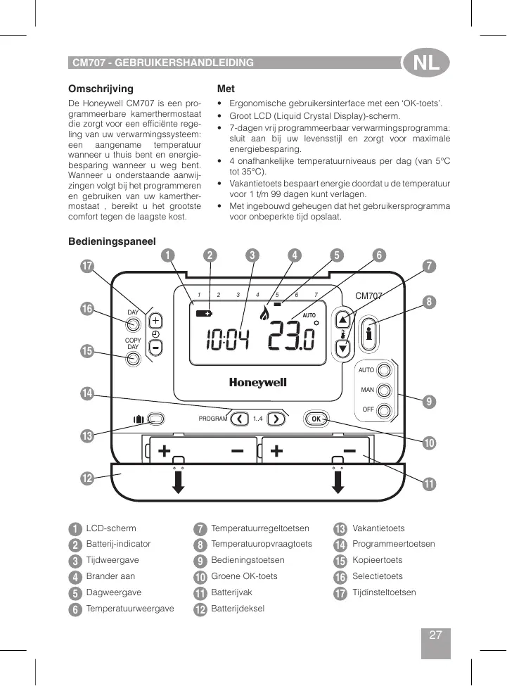 De Honeywell CM707 is een programmeerbare kamerthermostaat die zorgt voor een efficiënte regeling van uw verwarmingssysteem: een aangename temperatuur wanneer u thuis bent en energiebesparing wanneer u weg bent. Wanneer u onderstaande aanwijzingen volgt bij het programmeren en gebruiken van uw kamerthermostaat , bereikt u het grootste comfort tegen de laagste kost.