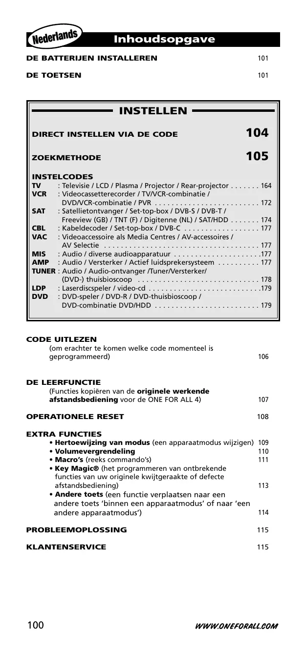 Als uw apparaat niet reageert, volgt u stap 1-5 met elke code die voor uw merk wordt vermeld. Als geen van de codes die voor uw merk worden vermeld, voor uw apparaat werkt, OF als uw merk helemaal niet wordt vermeld, probeert u de zoekmethode die wordt beschreven op pagina 105. Sommige codes lijken erg veel op elkaar. Als uw apparaat niet reageert of niet goed functioneert met een van de codes, probeert u een andere code die voor uw merk wordt vermeld. Druk wel op de juiste apparaattoets voordat u het apparaat bedient. Er kan maar één apparaat aan een apparaatmodus worden toegewezen. Als uw originele afstandsbediening meer dan een apparaat bedient, moet u beide apparaten afzonderlijk instellen. Als u merkt dat bepaalde functies ontbreken, kunt u deze laten ‘leren’ van de originele afstandsbediening of kunt u de ‘Magic®-toets’ gebruiken als de originele afstandsbediening defect is.