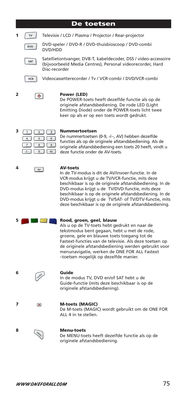 Rood, groen, geel, blauw Als u op de TV-toets hebt gedrukt en naar de tekstmodus bent gegaan, hebt u met de rode, groene, gele en blauwe toets toegang tot de Fastext-functies van de televisie. Als deze toetsen op de originele afstandsbediening werden gebruikt voor menunavigatie, werken de ONE FOR ALL Fastext –toetsen mogelijk op dezelfde manier.