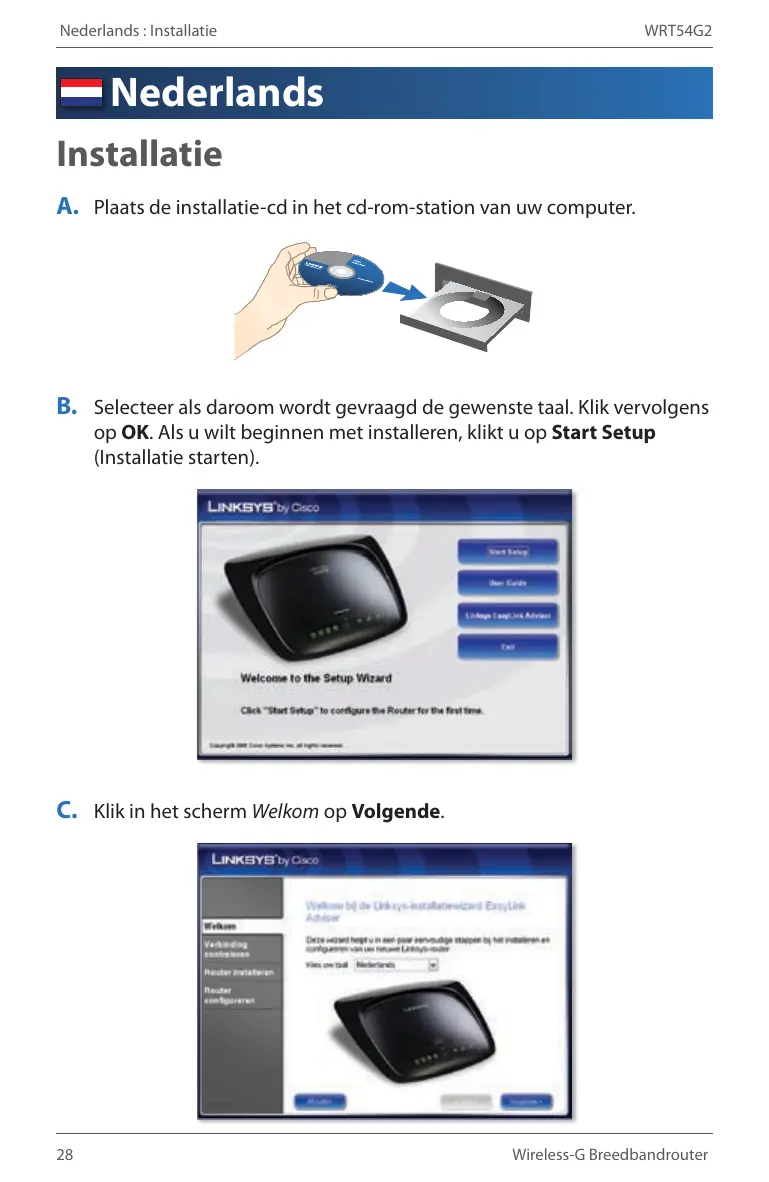 Nederlands : Installatie WRT54G2 Nederlands Installatie A. Plaats de installatie-cd in het cd-rom-station van uw computer. B. Selecteer als daroom wordt gevraagd de gewenste taal. Klik vervolgens op OK. Als u wilt beginnen met installeren, klikt u op Start Setup (Installatie starten). C. Klik in het scherm Welkom op Volgende.
