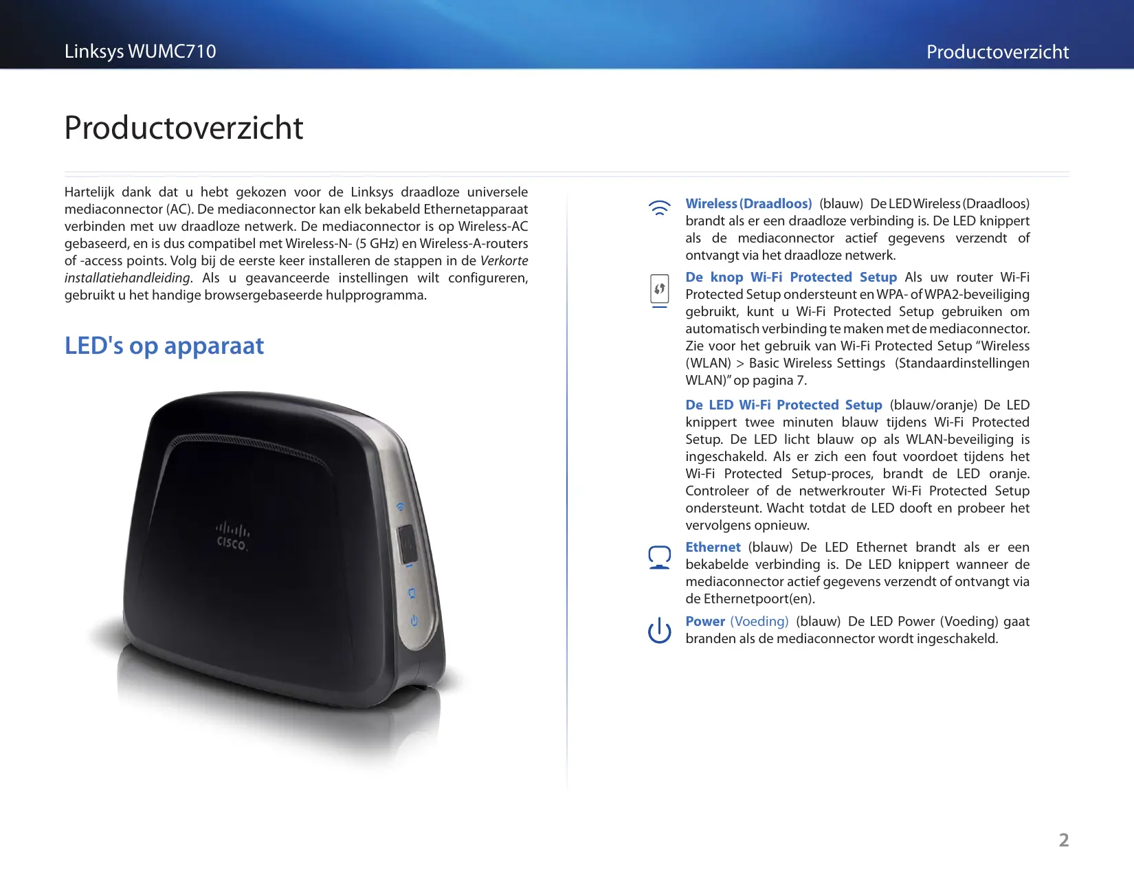Productoverzicht Hartelijk dank dat u hebt gekozen voor de Linksys draadloze universele mediaconnector (AC). De mediaconnector kan elk bekabeld Ethernetapparaat verbinden met uw draadloze netwerk. De mediaconnector is op Wireless-AC gebaseerd, en is dus compatibel met Wireless-N- (5 GHz) en Wireless-A-routers of -access points. Volg bij de eerste keer installeren de stappen in de Verkorte installatiehandleiding. Als u geavanceerde instellingen wilt configureren, gebruikt u het handige browsergebaseerde hulpprogramma.