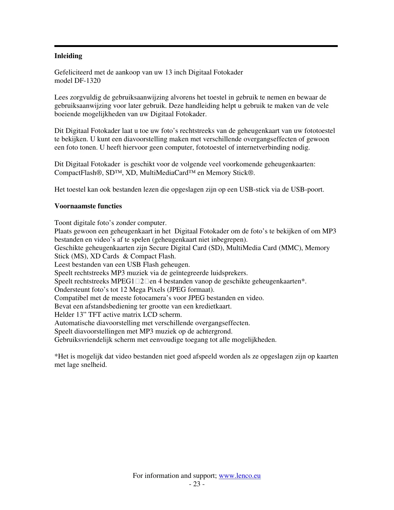 Inleiding Gefeliciteerd met de aankoop van uw 13 inch Digitaal Fotokader model DF-1320 Lees zorgvuldig de gebruiksaanwijzing alvorens het toestel in gebruik te nemen en bewaar de gebruiksaanwijzing voor later gebruik. Deze handleiding helpt u gebruik te maken van de vele boeiende mogelijkheden van uw Digitaal Fotokader. Dit Digitaal Fotokader laat u toe uw foto’s rechtstreeks van de geheugenkaart van uw fototoestel te bekijken. U kunt een diavoorstelling maken met verschillende overgangseffecten of gewoon een foto tonen. U heeft hiervoor geen computer, fototoestel of internetverbinding nodig. Dit Digitaal Fotokader is geschikt voor de volgende veel voorkomende geheugenkaarten: CompactFlash®, SD™, XD, MultiMediaCard™ en Memory Stick®. Het toestel kan ook bestanden lezen die opgeslagen zijn op een USB-stick via de USB-poort. Voornaamste functies Toont digitale foto’s zonder computer. Plaats gewoon een geheugenkaart in het Digitaal Fotokader om de foto’s te bekijken of om MP3 bestanden en video’s af te spelen (geheugenkaart niet inbegrepen). Geschikte geheugenkaarten zijn Secure Digital Card (SD), MultiMedia Card (MMC), Memory Stick (MS), XD Cards & Compact Flash. Leest bestanden van een USB Flash geheugen. Speelt rechtstreeks MP3 muziek via de geïntegreerde luidsprekers. Speelt rechtstreeks MPEG1 2 en 4 bestanden vanop de geschikte geheugenkaarten*. Ondersteunt foto’s tot 12 Mega Pixels (JPEG formaat). Compatibel met de meeste fotocamera’s voor JPEG bestanden en video. Bevat een afstandsbediening ter grootte van een kredietkaart. Helder 13” TFT active matrix LCD scherm. Automatische diavoorstelling met verschillende overgangseffecten. Speelt diavoorstellingen met MP3 muziek op de achtergrond. Gebruiksvriendelijk scherm met eenvoudige toegang tot alle mogelijkheden. *Het is mogelijk dat video bestanden niet goed afspeeld worden als ze opgeslagen zijn op kaarten met lage snelheid. For information and support; www.lenco.eu