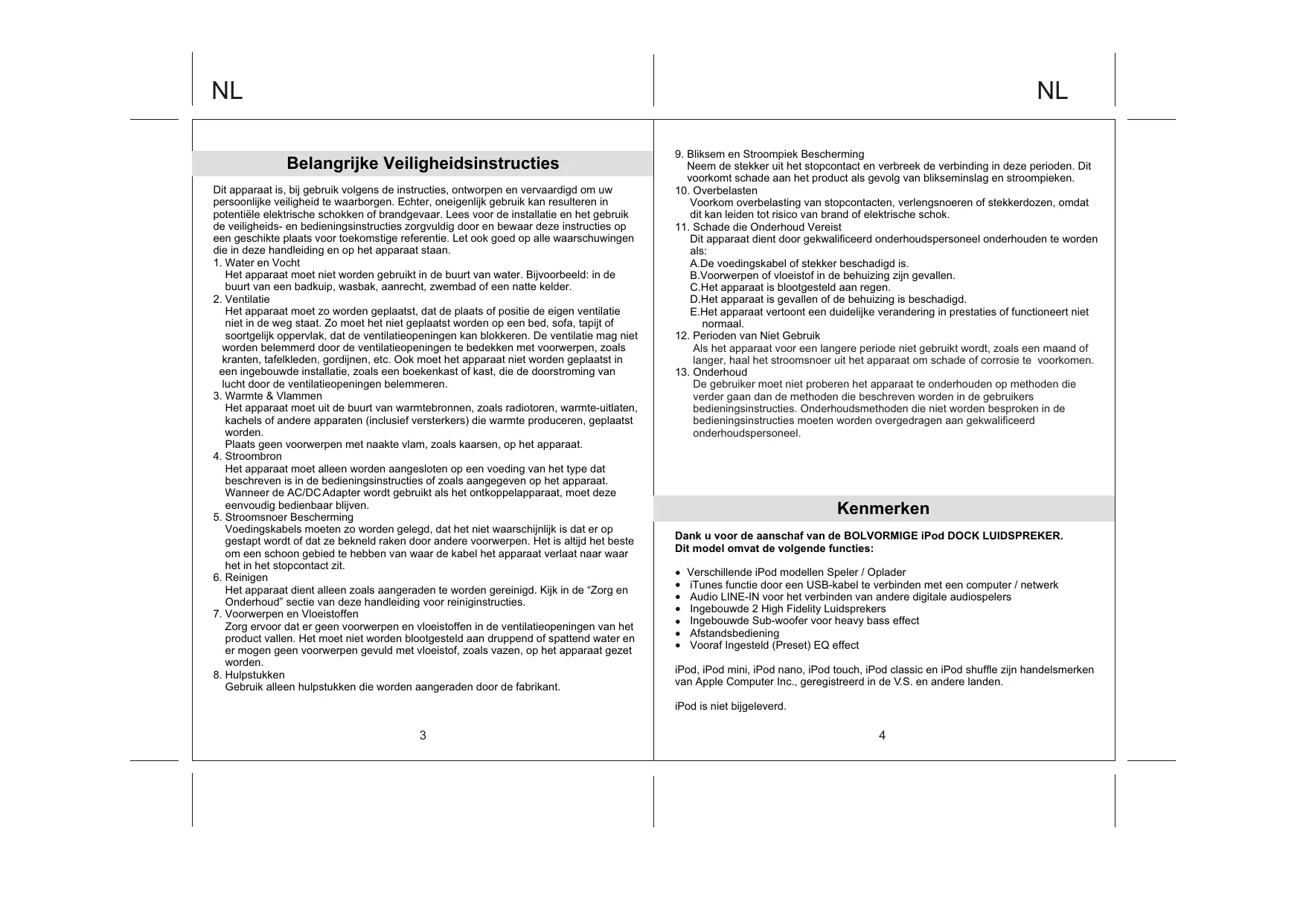 De gebruiker moet niet proberen het apparaat te onderhouden op methoden die verder gaan dan de methoden die beschreven worden in de gebruikers bedieningsinstructies. Onderhoudsmethoden die niet worden besproken in de bedieningsinstructies moeten worden overgedragen aan gekwalificeerd onderhoudspersoneel. Kenmerken Dank u voor de aanschaf van de BOLVORMIGE iPod DOCK LUIDSPREKER. Dit model omvat de volgende functies: Verschillende iPod modellen Speler / Oplader iTunes functie door een USB-kabel te verbinden met een computer / netwerk Audio LINE-IN voor het verbinden van andere digitale audiospelers Ingebouwde 2 High Fidelity Luidsprekers Ingebouwde Sub-woofer voor heavy bass effect Afstandsbediening Vooraf Ingesteld (Preset) EQ effect iPod, iPod mini, iPod nano, iPod touch, iPod classic en iPod shuffle zijn handelsmerken van Apple Computer Inc., geregistreerd in de V.S. en andere landen. iPod is niet bijgeleverd.
