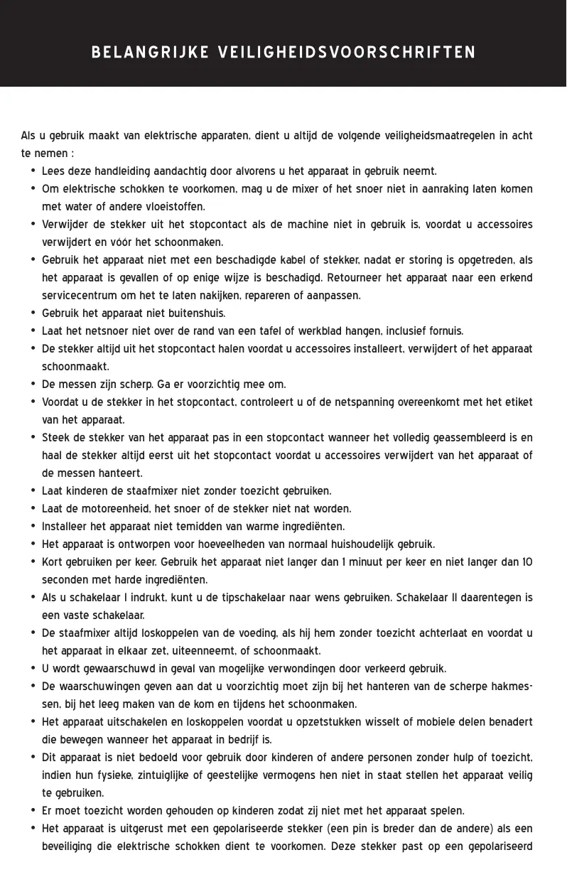 • Débrancher l’appareil de la prise électrique lorsqu’il n’est pas utilisé, avant de le monter ou d’en ôter des accessoires et avant de le nettoyer. • Ne mettez jamais sous tension un appareil dont le cordon d’alimentation est endommagé, ou après avoir constaté un dysfonctionnement, ou s’il a subi une chute ou un dommage quel qu’il soit. Apportez l’appareil à un service après-vente agréé afin que le faire réviser, réparer ou régler. • Ne pas utiliser à l’extérieur. • Évitez de laisser pendre le cordon d’alimentation du plan de travail ou du comptoir, ne pas le mettre en contact avec des surfaces chaudes, comme une plaque chauffante. • N’oubliez pas de débrancher l’appareil avant de l’assembler, le démonter ou le nettoyer. • Les lames sont tranchantes. Manipulez-les avec précaution. • Avant de brancher l’appareil à une prise murale, vérifiez que le voltage de votre domicile correspond à celui indiqué sur l’appareil. • Ne branchez pas l’appareil à la source d’alimentation avant d’avoir terminé l’assemblage des accessoires et débranchez-le avant de démonter l’appareil ou manipuler les lames. • Ne laissez pas des enfants utiliser le mixeur sans surveillance. • Évitez que le moteur, le cordon électrique ou la prise ne se mouille. • Ne mettez pas d’ingrédients chauds dans l’appareil. • L’appareil est prévu pour des quantités domestiques. • Délai de mise en service. N’utilisez pas l’appareil pendant plus d’un minute et pour les aliments consistants, plus de 10 secondes. • Si vous appuyez sur le bouton I, vous pouvez utiliser le bouton de réglage à votre convenance, mais pas avec le bouton II. • Débranchez le mixeur de la prise si vous ne l’utilisez pas, ou avant de le monter, de démonter ou le nettoyer. • Une mauvaise utilisation de cet appareil peut entraîner des dommages corporels • Vous devez manipuler les lames avec précaution lorsque vous videz le bol ou lors de leur nettoyage. • Mettez l’appareil hors tension et débranchez-le de la prise électrrique avant de changer un accessoire ou vous approcher des parties mobiles en cours d’utilisation. • Cet appareil n’est pas conçu pour être utilisé par des enfants ou des personnes sans surveillance si leurs capacités physiques, sensorielles ou mentales les empêchent de l’utiliser en toute sécurité. • Veillez à ce que des enfants ne se trouvent pas en mesure de jouer avec l’appareil. • L’appareil est pourvu d’une prise polarisée (une lame est plus large que l’autre). Pour réduire les risques de décharges électriques, cette prise ne convient qu’à une prise polarisée. Essayez de brancher la prise dans l’autre sens. Si elle ne s’adapte pas à la prise, contact un électricien agréé. Ne changez surtout pas la prise. • N’approchez pas vos mains ou des ustensiles du bol en cours d’utilisation / et à distance des lames lorsque vous hachez des aliments pour éviter de graves blessures ou d’endommager l’appareil. Un grattoir peut être utilisé mais seulement lorsque l’appareil ne fonctionne pas. 17