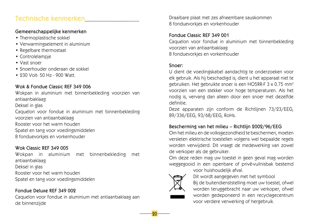 - 230 Volt- 50 Hz - 900 Watt. Fondue Classic REF 349 001 Caquelon voor fondue in aluminium met binnenbekleding voorzien van antiaanbaklaag 8 fonduevorkjes en vorkenhouder Snoer: U dient de voedingskabel aandachtig te onderzoeken voor elk gebruik. Als hij beschadigd is, dient u het apparaat niet te gebruiken. Het gebruikte snoer is een HO5RR-F 3 x 0.75 mm2 voorzien van een stekker voor hoge temperaturen. Als het nodig is, vervang dan alleen door een snoer met dezelfde definitie. Deze apparaten zijn conform de Richtlijnen 73/23/EEG, 89/336/EEG, 93/68/EEG, RoHs. Wok & Fondue Classic REF 349 006 Wokpan in aluminium met binnenbekleding voorzien van antiaanbaklaag Deksel in glas Caquelon voor fondue in aluminium met binnenbekleding voorzien van antiaanbaklaag Rooster voor het warm houden Spatel en tang voor voedingsmiddelen 8 fonduevorkjes en vorkenhouder Wok Classic REF 349 005 Wokpan in aluminium met binnenbekleding antiaanbaklaag Deksel in glas Rooster voor het warm houden Spatel en tang voor voedingsmiddelen Bescherming van het milieu – Richtlijn 2002/96/EEG Om het milieu en de volksgezondheid te beschermen, moeten versleten elektrische toestellen volgens wel bepaalde regels worden verwijderd. Dit vraagt de medewerking van zowel de verkoper als de gebruiker. Om deze reden mag uw toestel in geen geval mag worden weggegooid in een openbare of privé-vuilnisbak bestemd voor huishoudelijk afval. Dit wordt aangegeven met het symbool Bij de buitendienststelling moet uw toestel, ofwel worden teruggebracht naar uw verkoper, ofwel worden gedeponeerd in een recyclagecentrum voor verdere verwerking of hergebruik. met Fondue Deluxe REF 349 002 Caquelon voor fondue in aluminium met antiaanbaklaag aan de binnenzijde