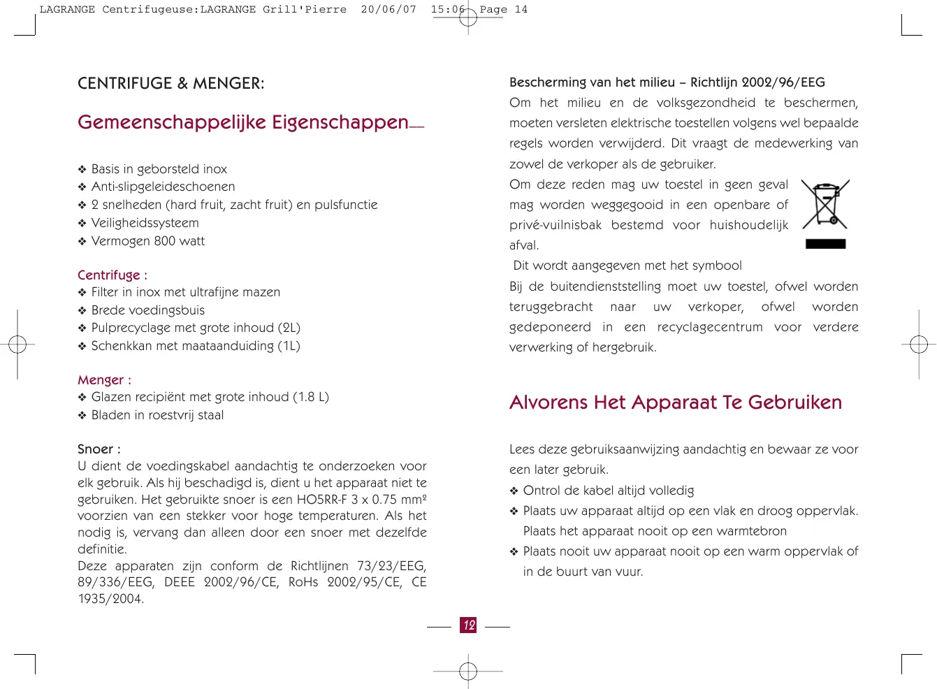 Om deze reden mag uw toestel in geen geval mag worden wegegooid in een openbare of privé-vuilnisbak bestemd voor huishoudelijk afval.