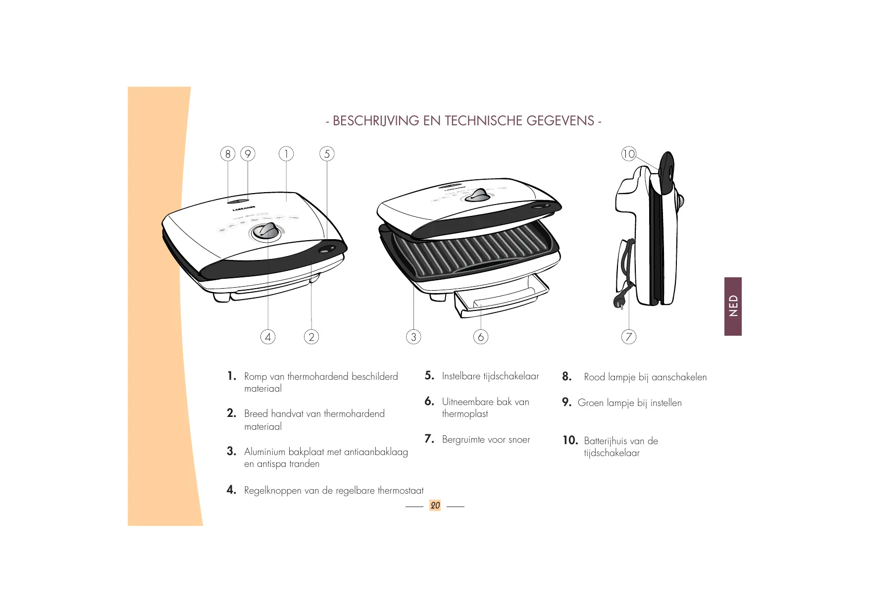• Se puede detener la señal pulsando una vez en el botón, sino se detiene automáticamente al cabo de 10 veces. Cuidado: el contador de tiempo no para el aparato, simplemente indica que ha trascurrido el tiempo programado. También se puede programar de nuevo otro tiempo. El piloto verde puede apagarse y encenderse durante el funcionamiento. Sirve para indicar que se ha alcanzado la temperatura ajustada. No utilizar ningún utensilio metálico para manipular los alimentos sobre la placa eléctrica (se puede dañar el recubrimiento antiadherente). Cuando se guarda el aparato durante muchos años hay que retirar la pila del contador de tiempo y entregarla en un centro de recogida especializado.