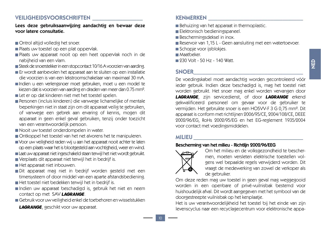 OPBERGEN van het apparaat________________ Garantievoorwaarden ____________________ Uw toestel heeft een garantie van 2 jaar. Om gratis te kunnen genieten van een bijkomend jaar garantie, (www.lagrange.fr). registreer u op onze internetsite van De garantie dekt onderdelen en werk en dekt eveneens de fabricatiefouten. Zijn van de waarborg uitgesloten: de beschadigingen voortkomend uit een verkeerd gebruik of gebruik niet volgens de handleiding, en de breuken als gevolg van vallen. Ontkoppel het apparaat na gebruik. Maak het reservoir leeg als u niet onmiddellijk het toestel opnieuw gaat gebruiken. Steeds alle elementen goed wassen en drogen alvorens ze op te bergen. Laat het toestel verluchten zonder de schuif zodat het van binnen kan uitdrogen. Ontkoppel het snoer, plooi het op, en berg het op in de droge maatbeker. Doe de maatbeker op zijn beurt in de ijslade en plaats deze in het toestel. Berg het toestel op een gemakkelijk toegankelijk en vlak oppervlak op. Leg niets bovenop uw toestel. DEZE WAARBORG IS VAN TOEPASSING OP HUISHOUDELIJK GEBRUIK, EN IN GEEN GEVAL OP PROFESSIONEEL GEBRUIK. De wettelijke waarborg, door de verkoper te eerbiedigen, sluit in geen geval de wettelijke waarborg uit, voor fabricatiegebreken of defecten ingevolge de artikelen 1641 en volgende van het Burgerlijke Wetboek, waartoe de Fabrikant gehouden is. In geval van defect of slechte werking, wend u tot uw verkoper. Wend u in geval van defect of slechte werking tot uw verkoper. In geval van technisch defect binnen de 8 dagen volgend op de aankoop, worden de apparaten omgeruild. Na deze termijn worden zij hersteld door de servicedienst van
