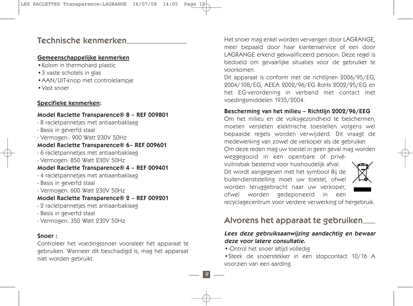 LES RACLETTES Transparence:LAGRANGE 16/07/08 14:05 Page 10 Technische kenmerken___________________ Het snoer mag enkel worden vervangen door LAGRANGE, meer bepaald door haar klantenservice of een door LAGRANGE erkend gekwalificeerd persoon. Deze regel is bedoeld om gevaarlijke situaties voor de gebruiker te voorkomen. Dit apparaat is conform met de richtlijnen 2006/95/EG, 2004/108/EG, AEEA 2002/96/EG RoHs 2002/95/EG en het EG-verordening in verband met contact met voedingsmiddelen 1935/2004. Gemeenschappelijke kenmerken