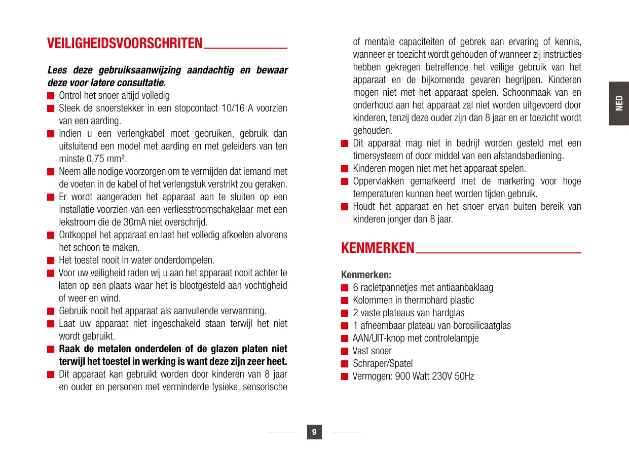 of mentale capaciteiten of gebrek aan ervaring of kennis, wanneer er toezicht wordt gehouden of wanneer zij instructies hebben gekregen betreffende het veilige gebruik van het apparaat en de bijkomende gevaren begrijpen. Kinderen mogen niet met het apparaat spelen. Schoonmaak van en onderhoud aan het apparaat zal niet worden uitgevoerd door kinderen, tenzij deze ouder zijn dan 8 jaar en er toezicht wordt gehouden. Dit apparaat mag niet in bedrijf worden gesteld met een timersysteem of door middel van een afstandsbediening. Kinderen mogen niet met het apparaat spelen. Oppervlakken gemarkeerd met de markering voor hoge temperaturen kunnen heet worden tijden gebruik. Houdt het apparaat en het snoer ervan buiten bereik van kinderen jonger dan 8 jaar. Lees deze gebruiksaanwijzing aandachtig en bewaar deze voor latere consultatie. Ontrol het snoer altijd volledig Steek de snoerstekker in een stopcontact 10/16 A voorzien van een aarding. Indien u een verlengkabel moet gebruiken, gebruik dan uitsluitend een model met aarding en met geleiders van ten minste 0,75 mm². Neem alle nodige voorzorgen om te vermijden dat iemand met de voeten in de kabel of het verlengstuk verstrikt zou geraken. Er wordt aangeraden het apparaat aan te sluiten op een installatie voorzien van een verliesstroomschakelaar met een lekstroom die de 30mA niet overschrijd. Ontkoppel het apparaat en laat het volledig afkoelen alvorens het schoon te maken. Het toestel nooit in water onderdompelen. Voor uw veiligheid raden wij u aan het apparaat nooit achter te laten op een plaats waar het is blootgesteld aan vochtigheid of weer en wind. Gebruik nooit het apparaat als aanvullende verwarming. Laat uw apparaat niet ingeschakeld staan terwijl het niet wordt gebruikt. aak de metalen onderdelen of de glazen platen niet terwijl het toestel in werking is want deze zijn zeer heet. Dit apparaat kan gebruikt worden door kinderen van 8 jaar en ouder en personen met verminderde fysieke, sensorische kenmerken Kenmerken: 6 racletpannetjes met antiaanbaklaag Kolommen in thermohard plastic 2 vaste plateaus van hardglas 1 afneembaar plateau van borosilicaatglas AAN/UIT-knop met controlelampje Vast snoer Schraper/Spatel Vermogen: 900 Watt 230V 50Hz