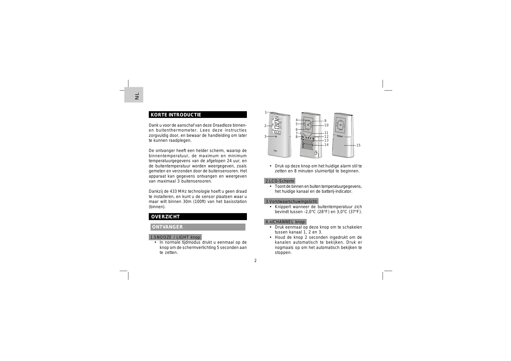 KORTE INTRODUCTIE Dank u voor de aanschaf van deze Draadloze binnenen buitenthermometer. Lees deze instructies zorgvuldig door, en bewaar de handleiding om later te kunnen raadplegen.