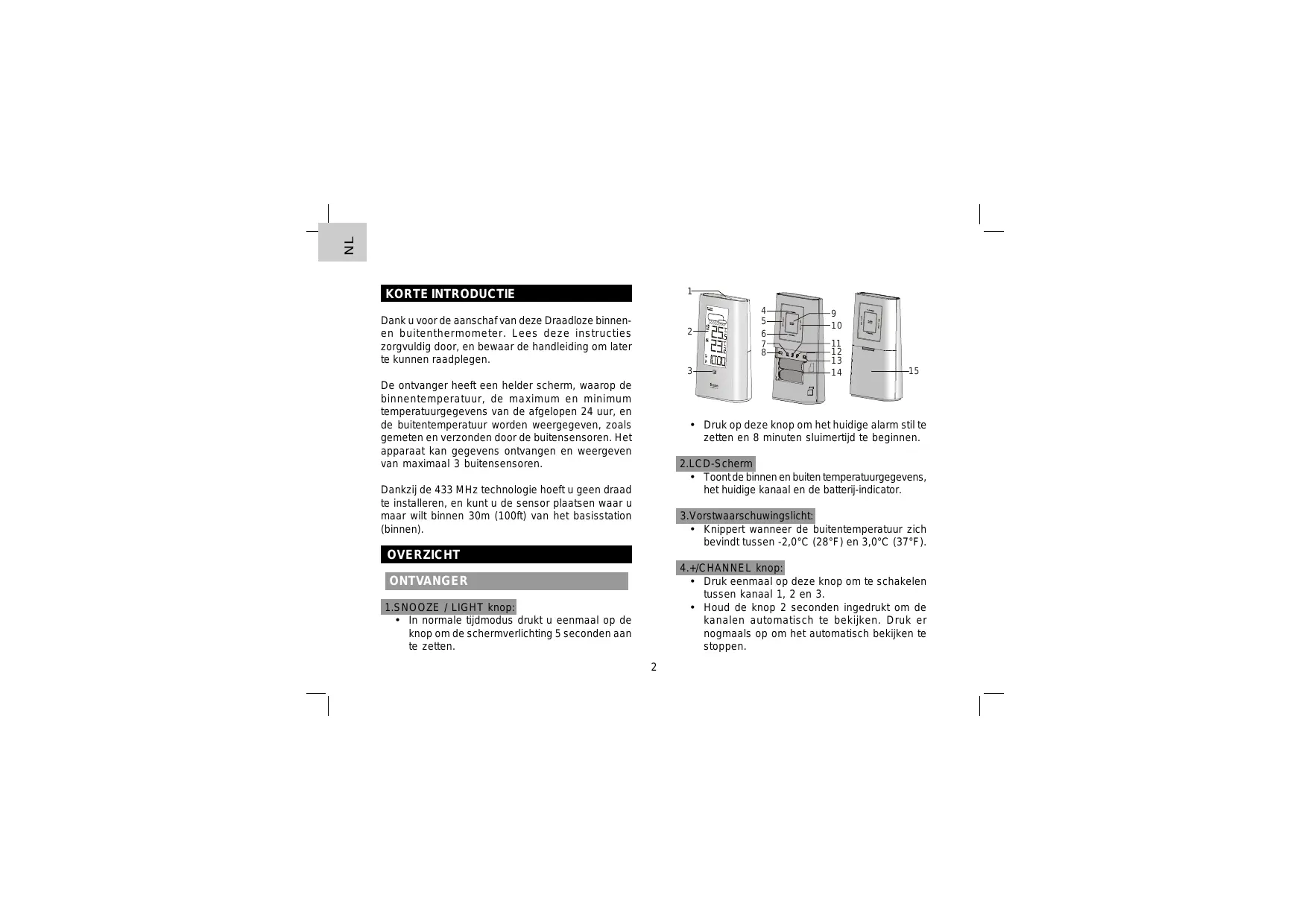 KORTE INTRODUCTIE Dank u voor de aanschaf van deze Draadloze binnenen buitenthermometer. Lees deze instructies zorgvuldig door, en bewaar de handleiding om later te kunnen raadplegen.